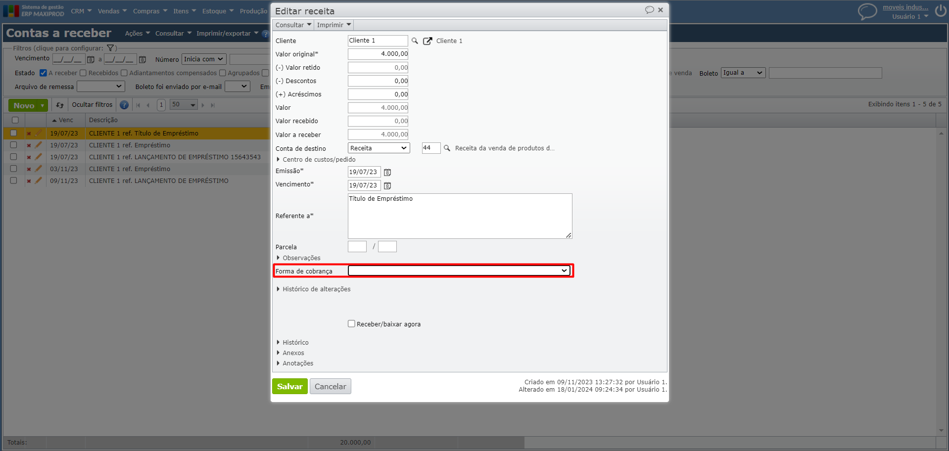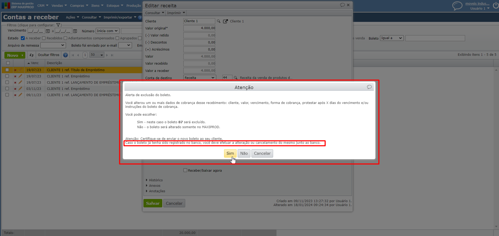 Você alterou um ou mais dados de cobrança desse recebimento: cliente, valor, vencimento, forma de cobrança, protestar após X dias do vencimento e/ou instruções do boleto de cobrança.