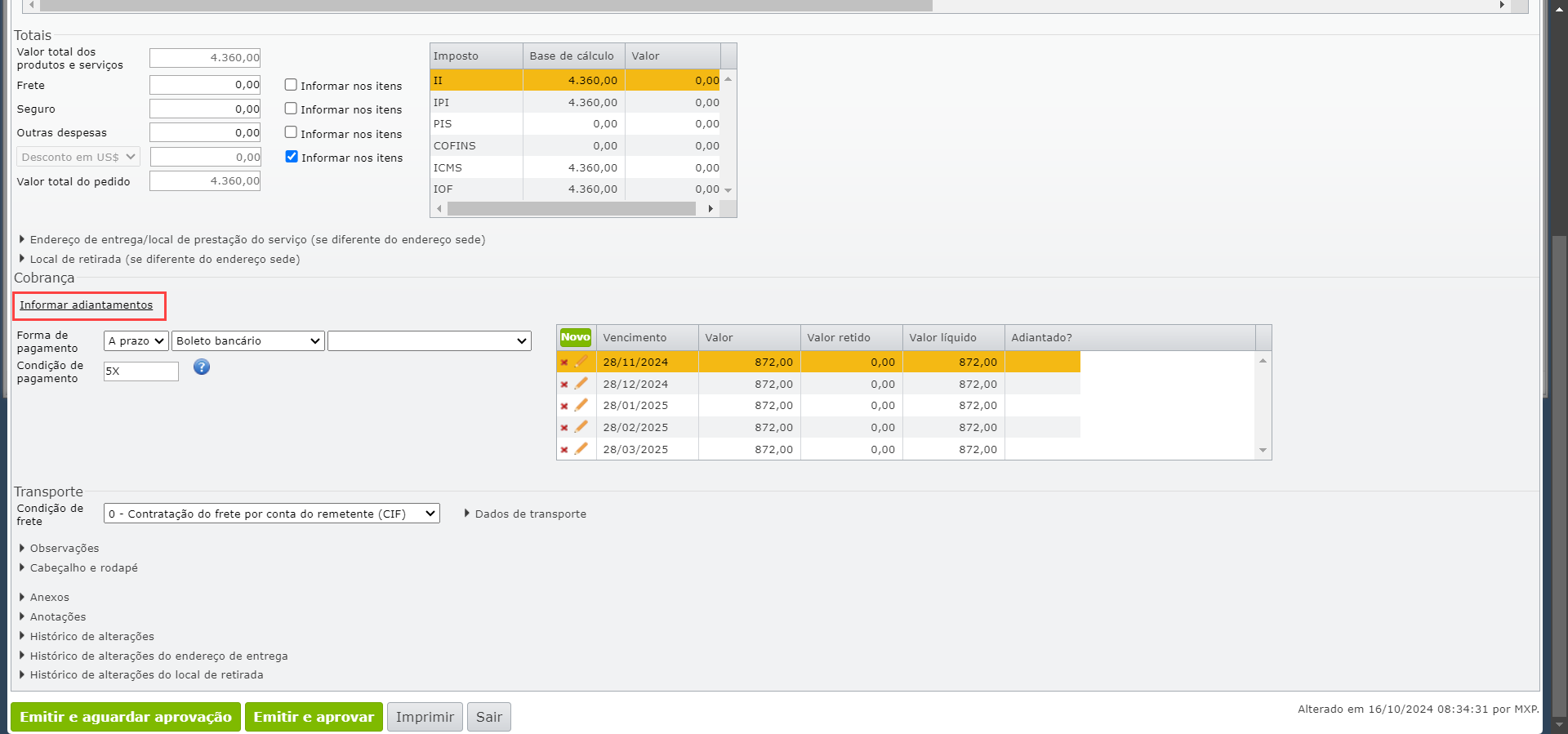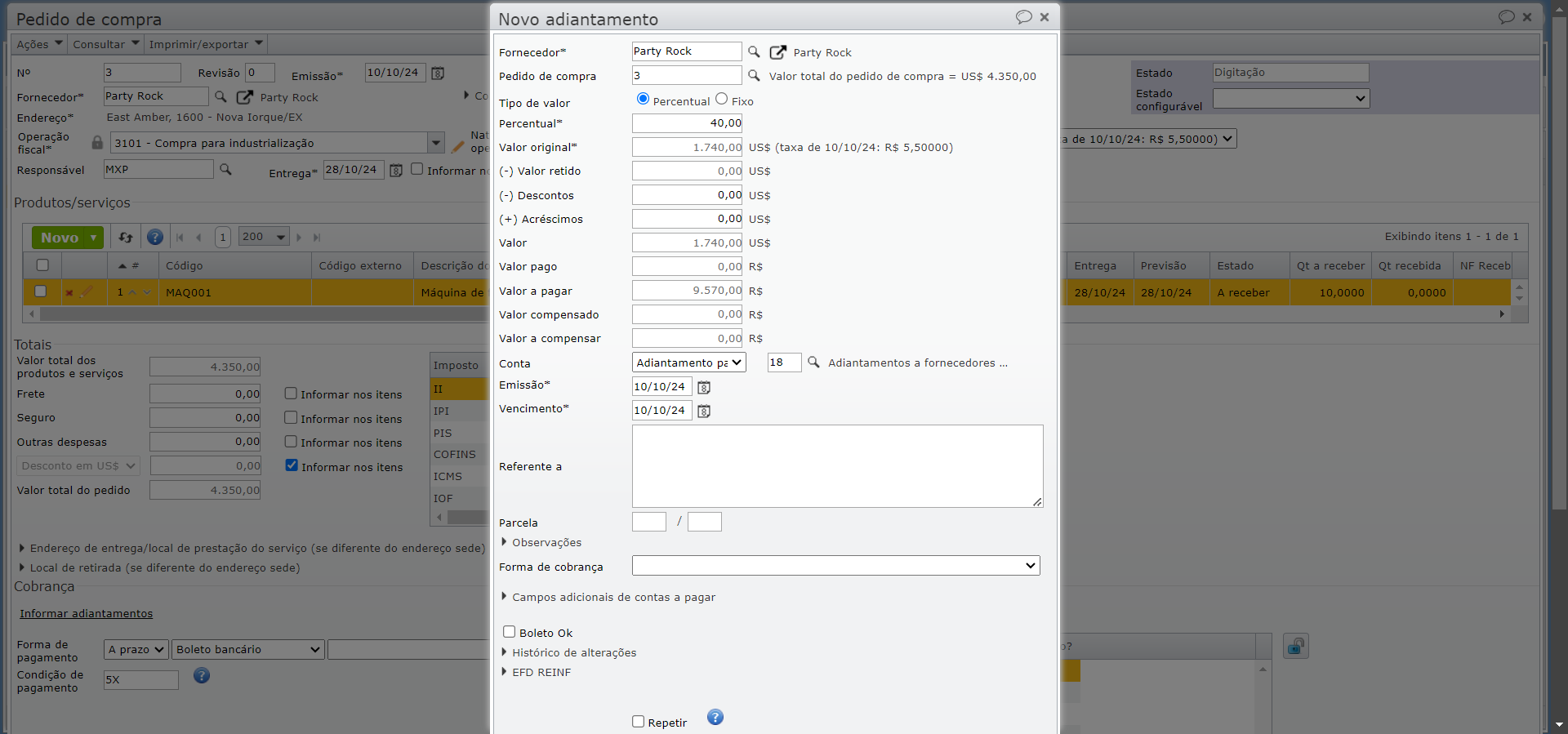 4) O adiantamento será inicializado na moeda estrangeira informada no pedido.