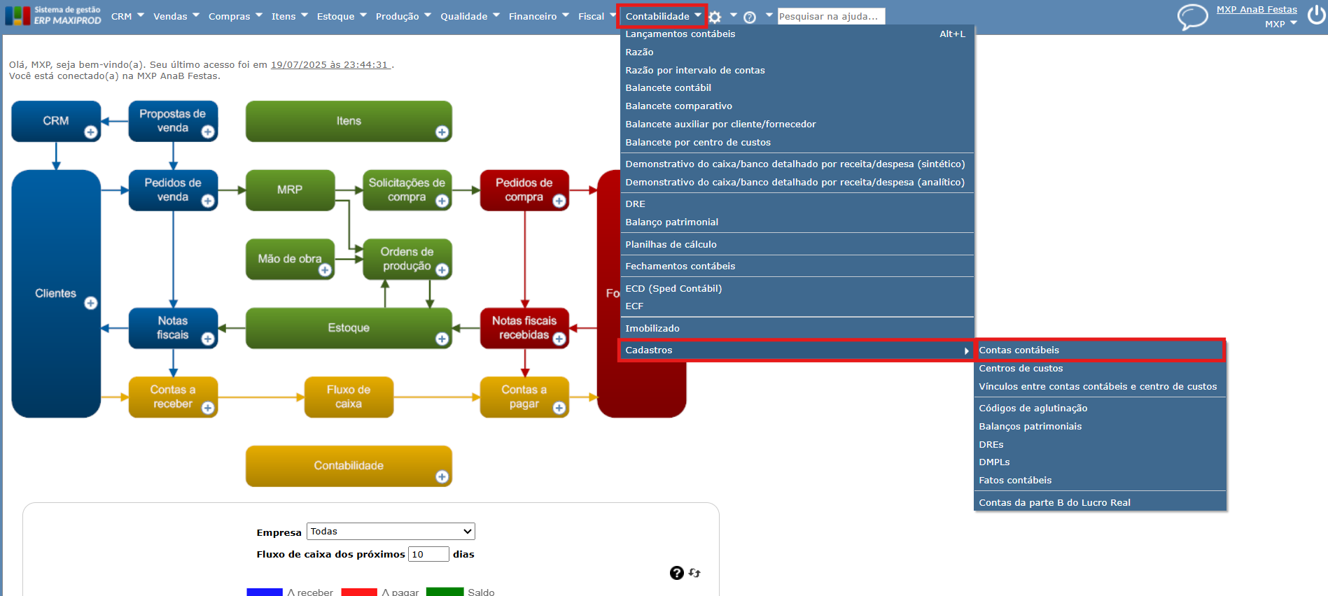 a) Para criar uma nova conta contábil, vá ao menu “Contabilidade > Cadastros > Contas contábeis”.