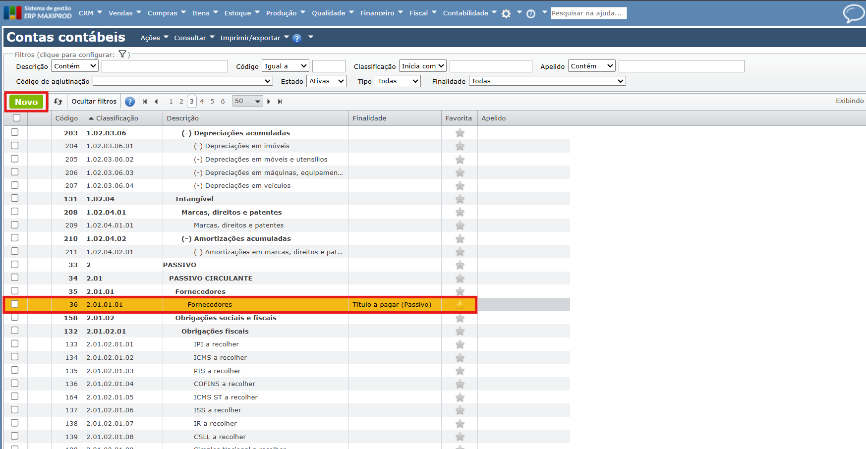 b) Na tela de contas contábeis, procure uma conta contábil semelhante à desejada, por exemplo, “36 – Fornecedores”. Selecione a conta, deixando sua linha amarelada, e clique no botão verde “Novo”.