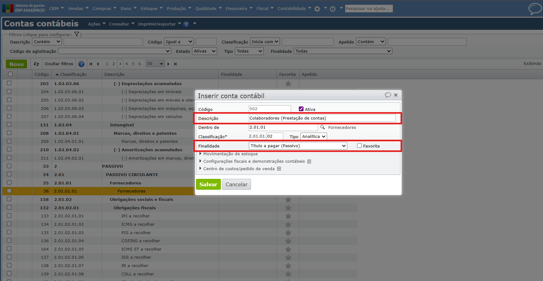 c) É aberta uma janela para “Inserir conta contábil”. Preencha a descrição, informe a finalidade dessa conta como “Título a pagar (Passivo)”. Clique no botão verde “Salvar” para guardar as alterações.