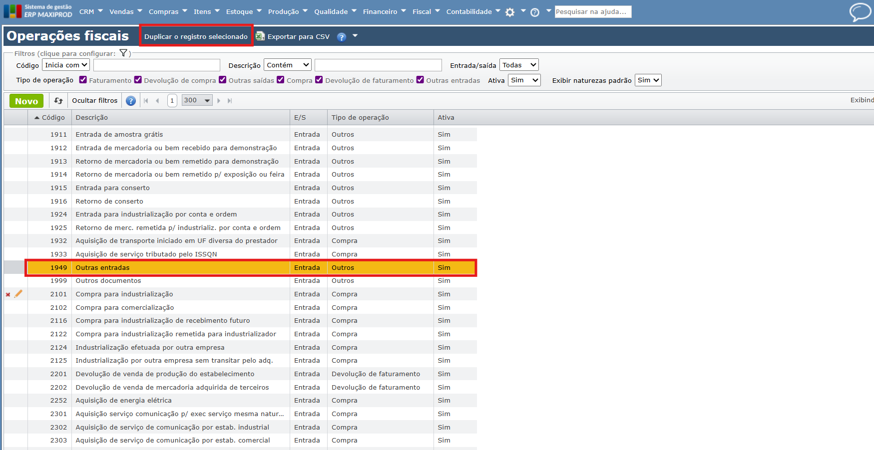 b) Na grade de operações fiscais, selecione uma operação fiscal de entrada, por exemplo, a operação fiscal “1949” ou “2949”, deixando a linha amarela. A seguir, clique na opção “Duplicar o registro selecionado”.