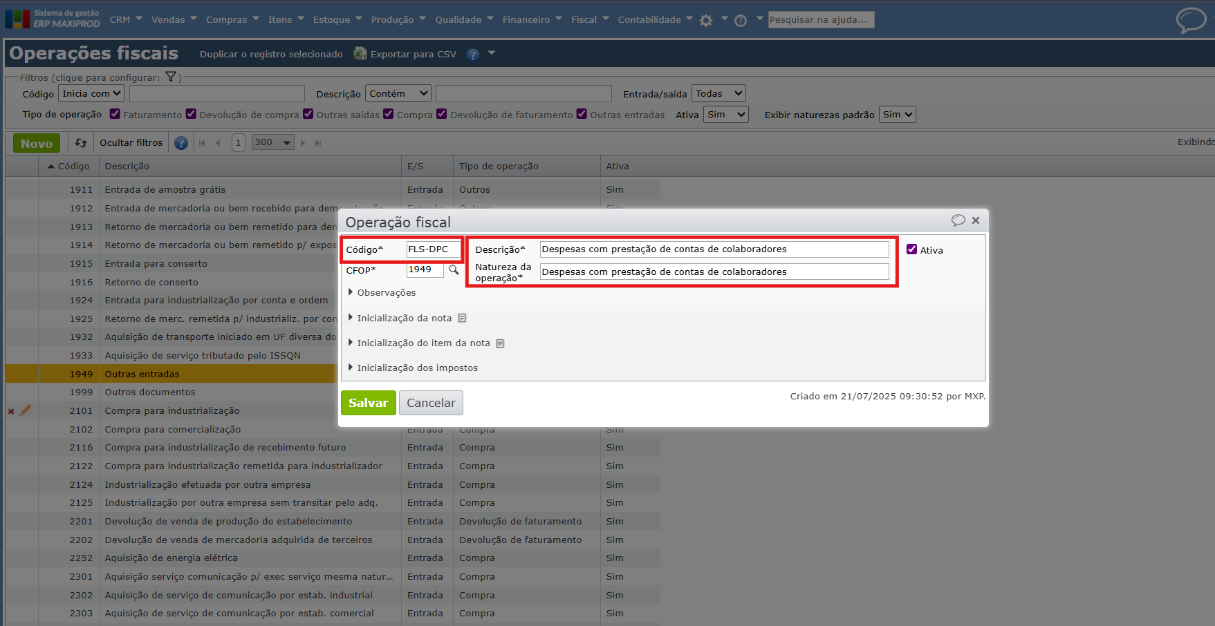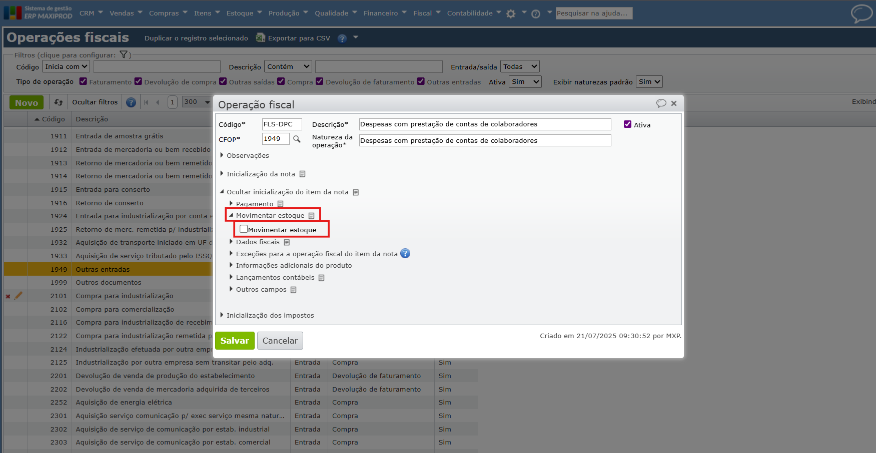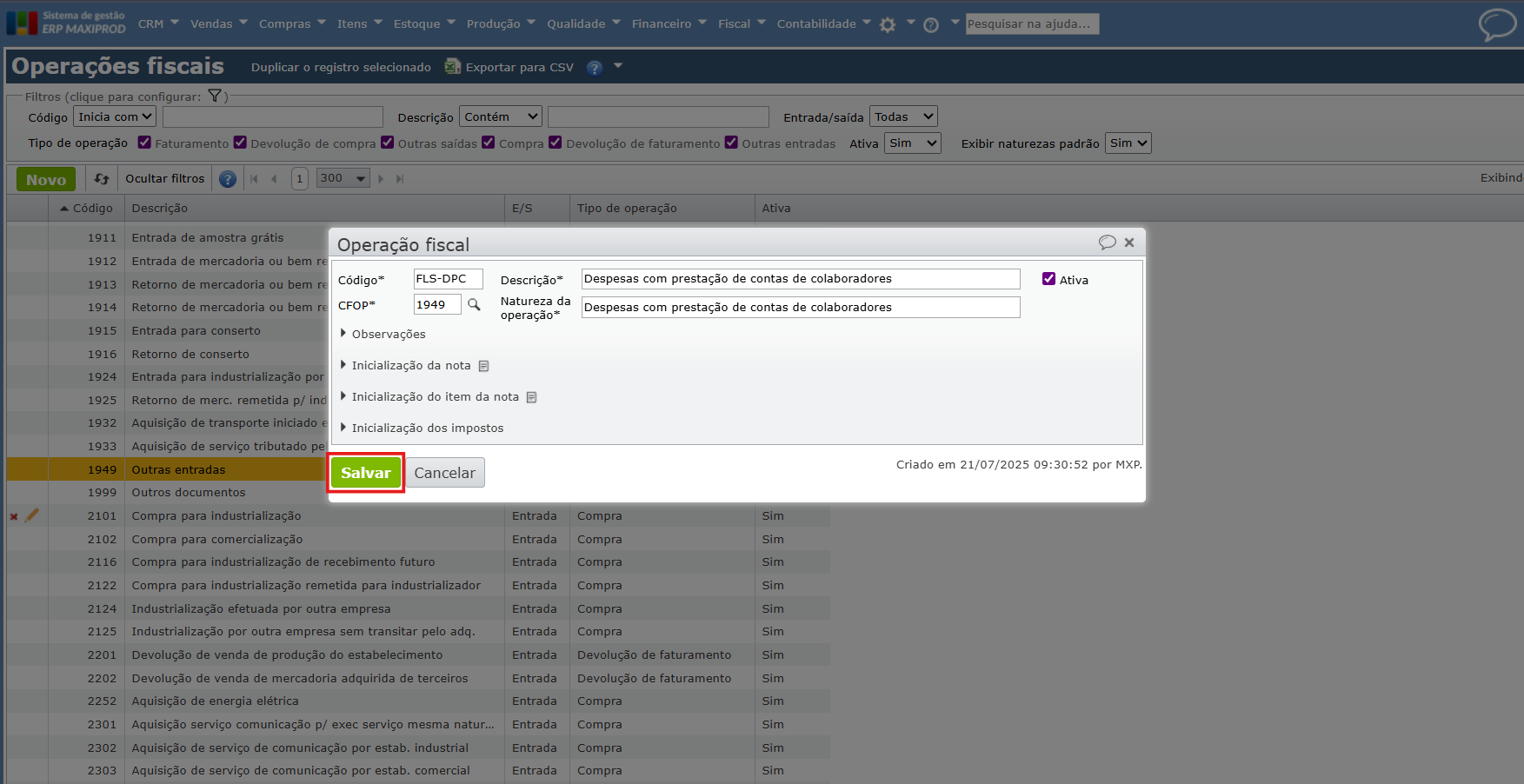 j) Assim que as edições na operação fiscal forem concluídas, clique no botão verde “Salvar”.