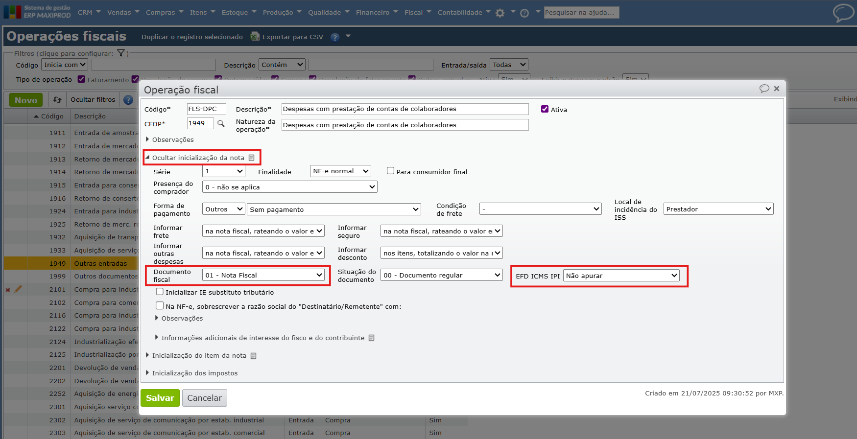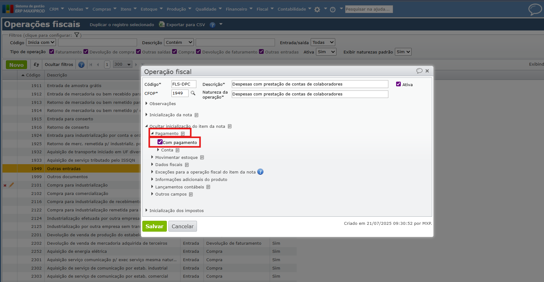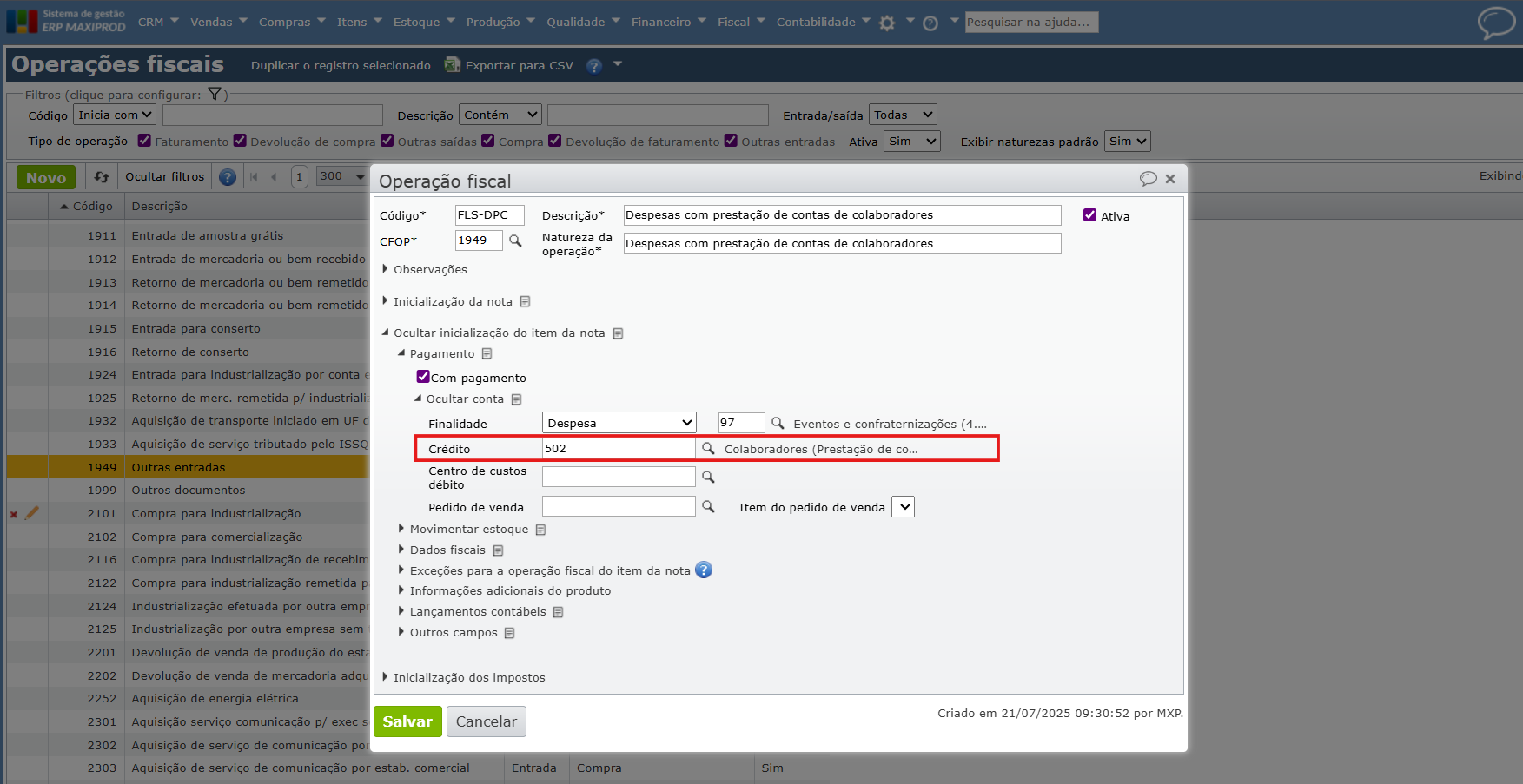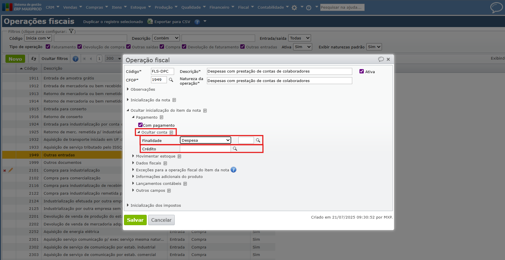 j) Assim que as edições na operação fiscal forem concluídas, clique no botão verde “Salvar”.