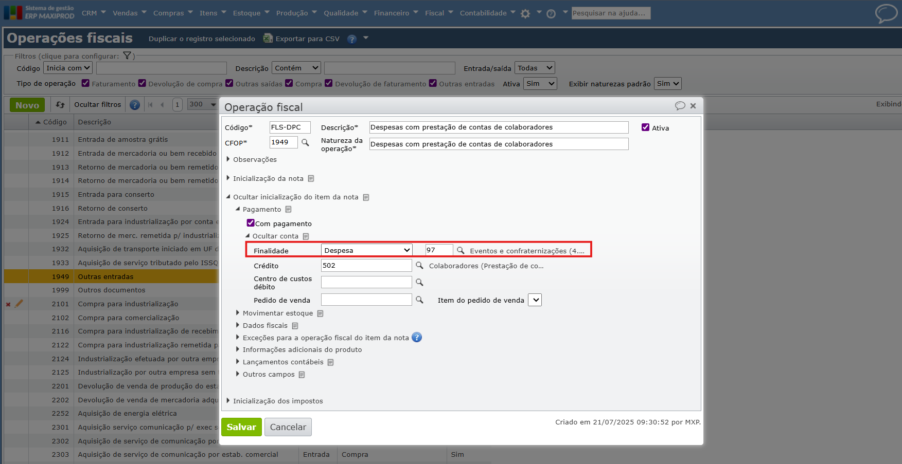 2) Assim que a conta contábil é criada, deve ser configurada uma operação fiscal para o lançamento das “Despesas com prestação de contas de colaboradores”.