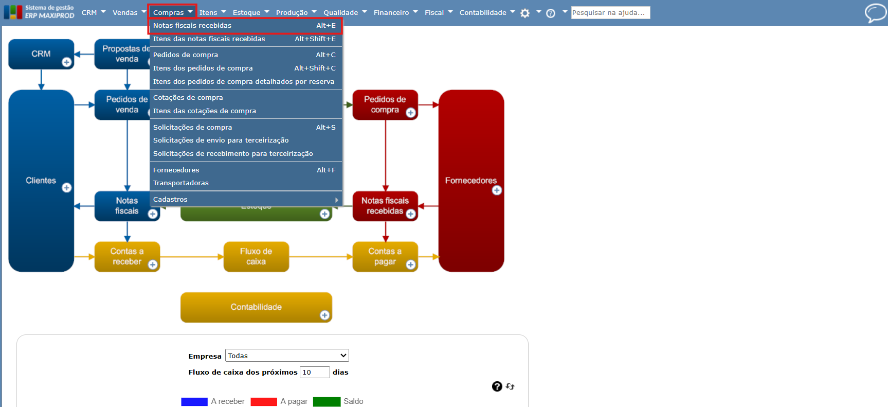 3) Para criar uma nota fiscal simbólica de despesas com prestação de contas, acesse o menu “Compras > Notas fiscais recebidas”.