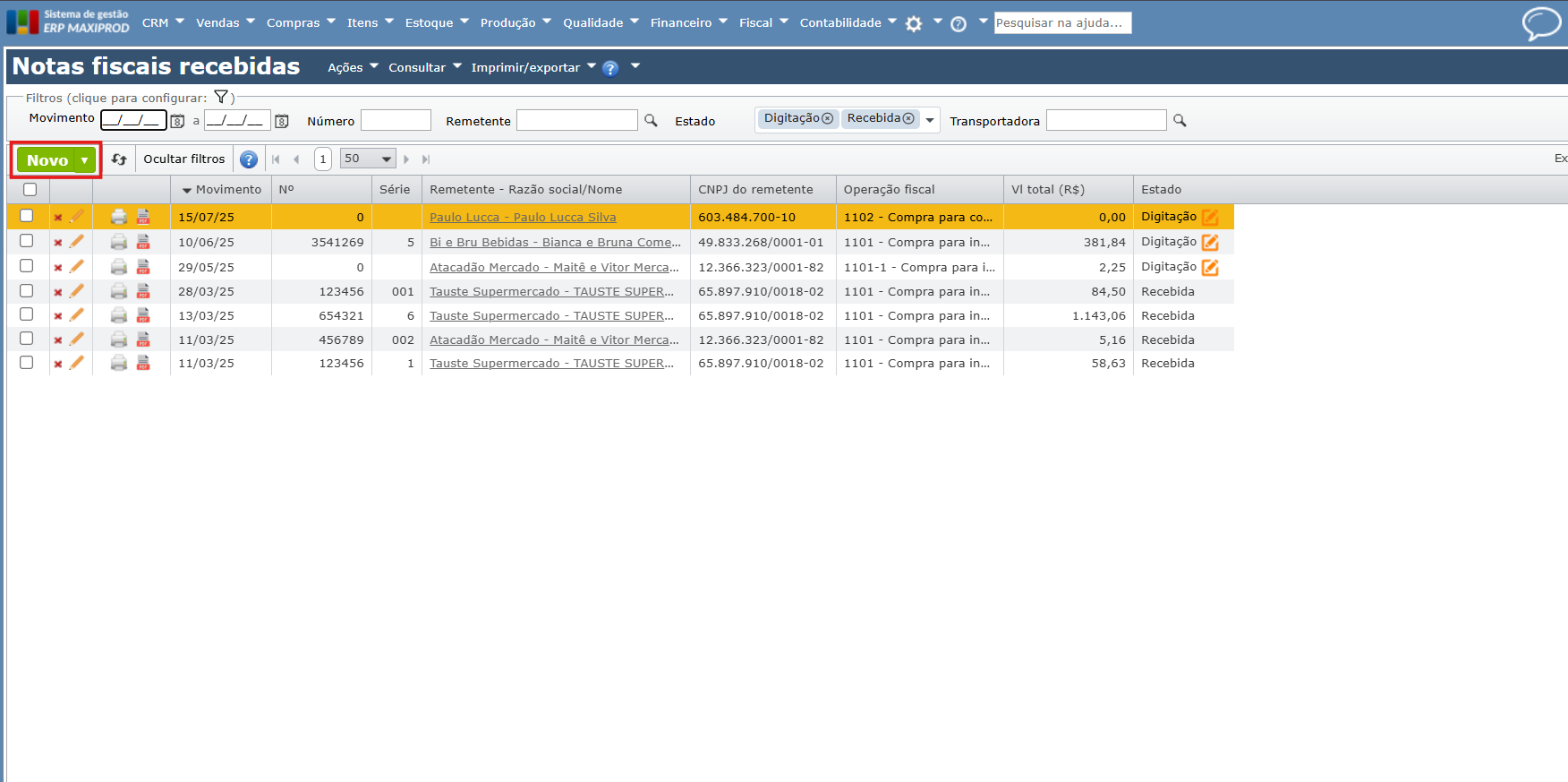 4) Na tela de “Notas fiscais recebidas”, clique no botão verde “Novo” para criar a nova nota fiscal.