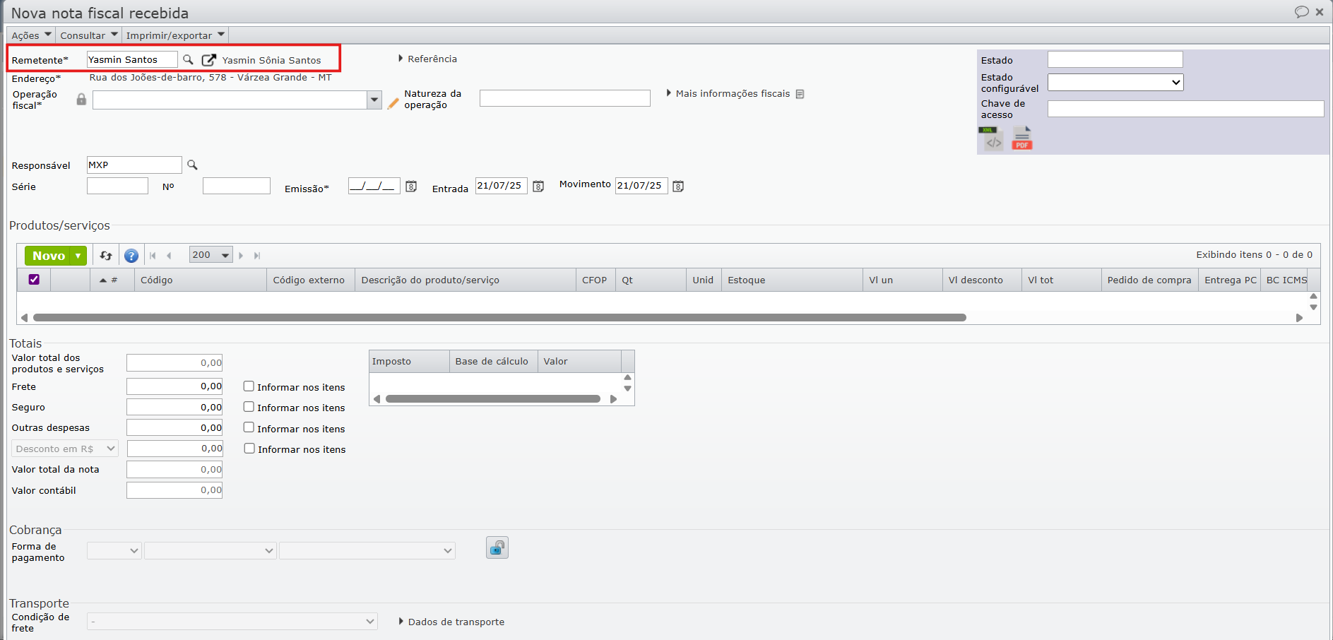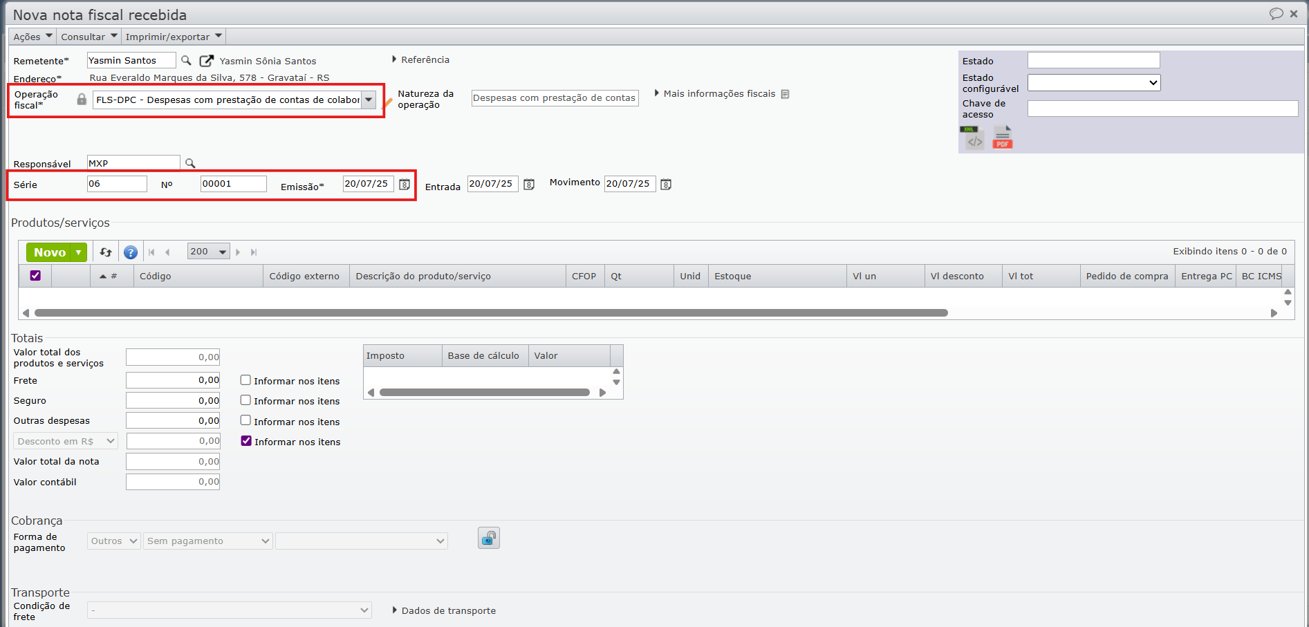 a) O campo “Remetente” na nota fiscal deve ser preenchido com o apelido do colaborador previamente cadastrado, para serem discriminadas as despesas com a prestação de contas. Se o colaborador não estiver cadastrado, veja como cadastrar colaboradores.