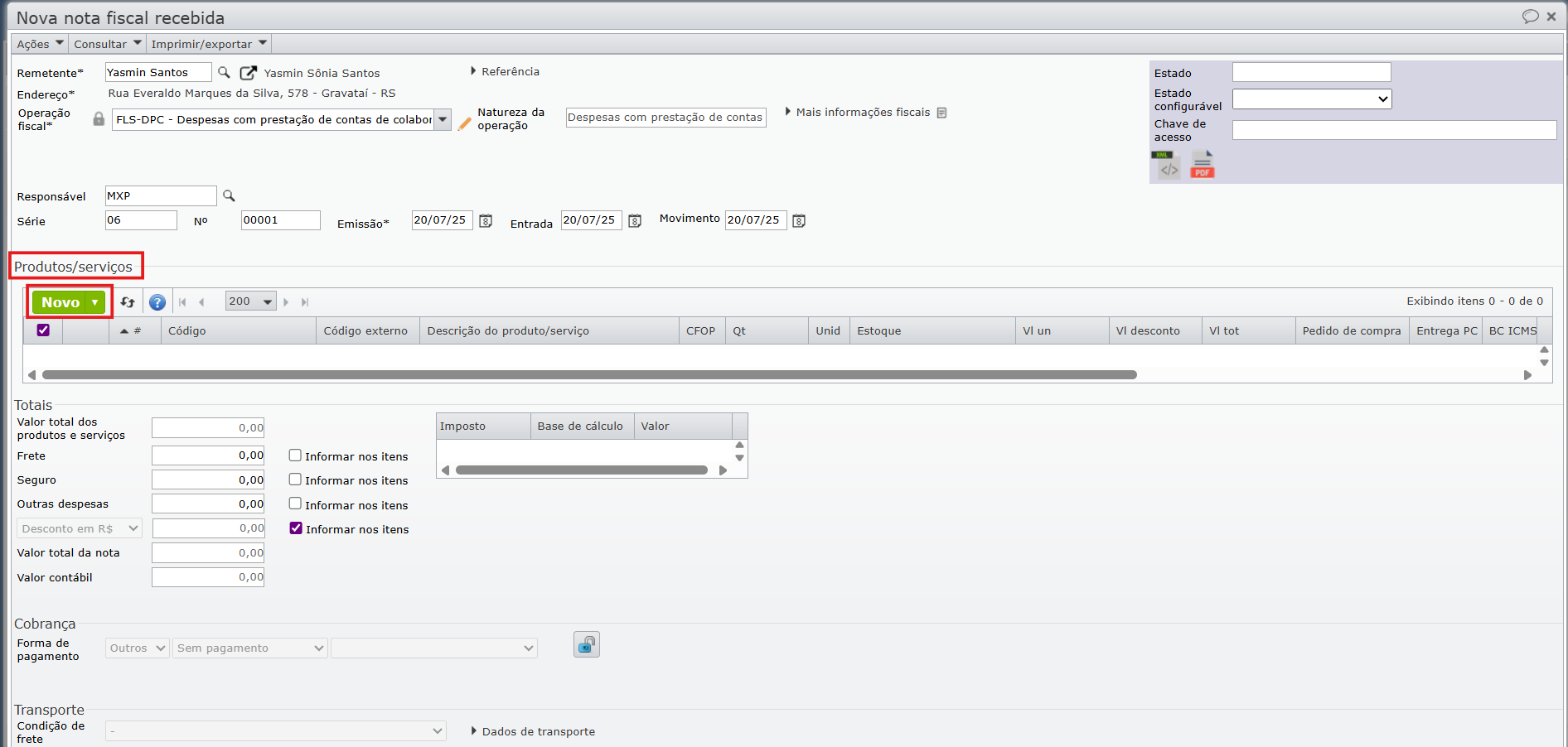 c) Clique no botão verde “Novo” da seção “Produtos/serviços”, para inserir os itens referentes a despesas realizadas em nome da empresa. Devem ser cadastrados itens referente a cada tipo de despesa, por exemplo, viagem, transporte, hospedagem e outras despesas relacionadas ao trabalho. Para saber sobre cadastro de itens, clique aqui.