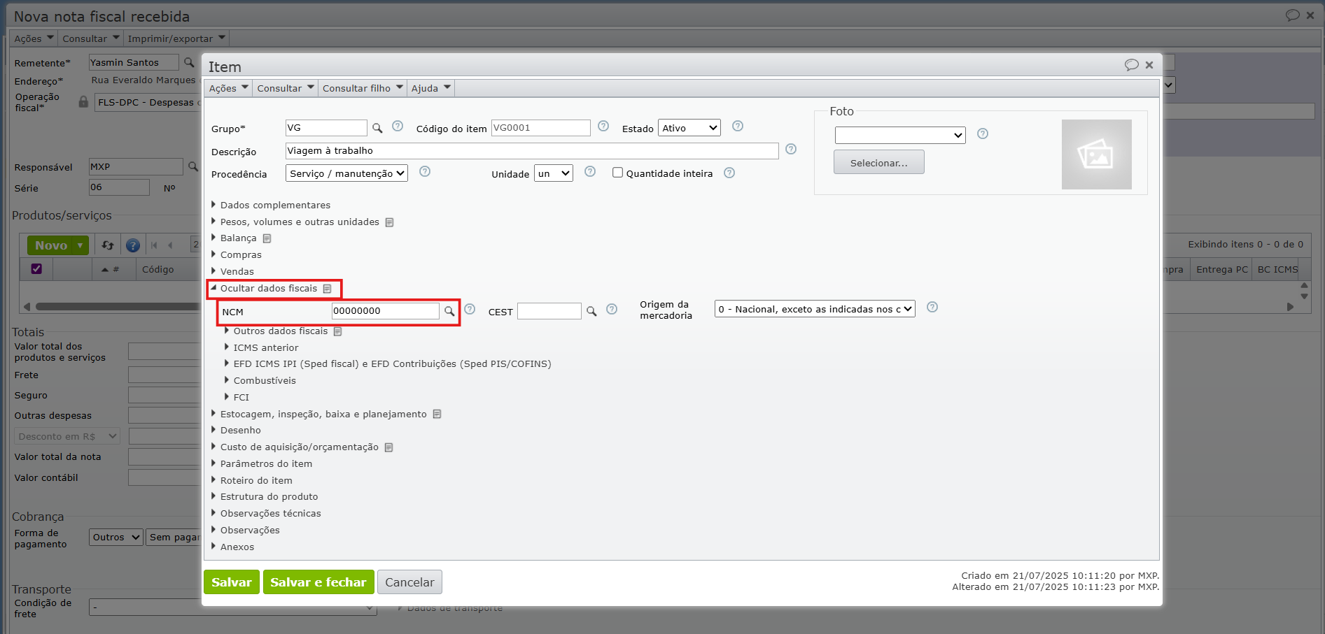 d) Ainda no cadastro do item, é importante informar uma NCM simbólica. Expanda a seção “Dados fiscais” e preencha o campo “NCM”, por exemplo, com “00000000”. Para saber mais sobre NCM, clique aqui.