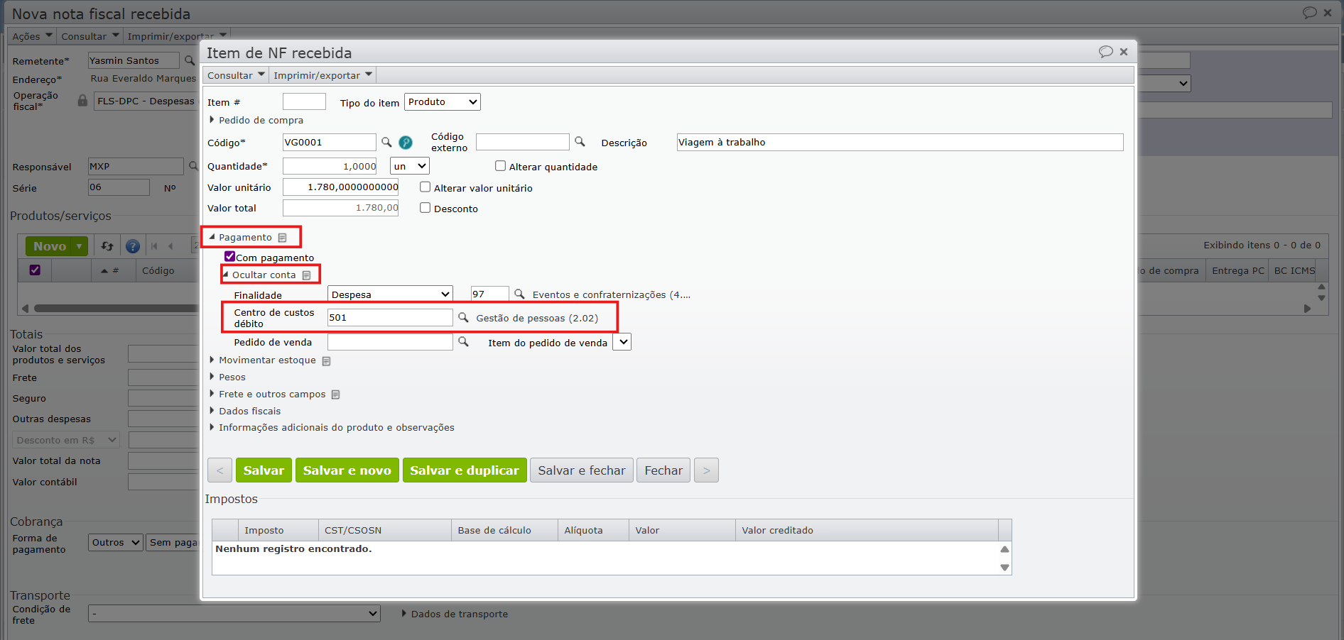 f) Altere o campo “Finalidade” para “Despesa” e escolha uma conta de débito padrão para as despesas com pessoal. Numa mesma nota, pode haver itens com diferentes finalidades, portanto despesas com diferentes contas contábeis, mas a configuração da operação fiscal é usada para a inicialização automática.