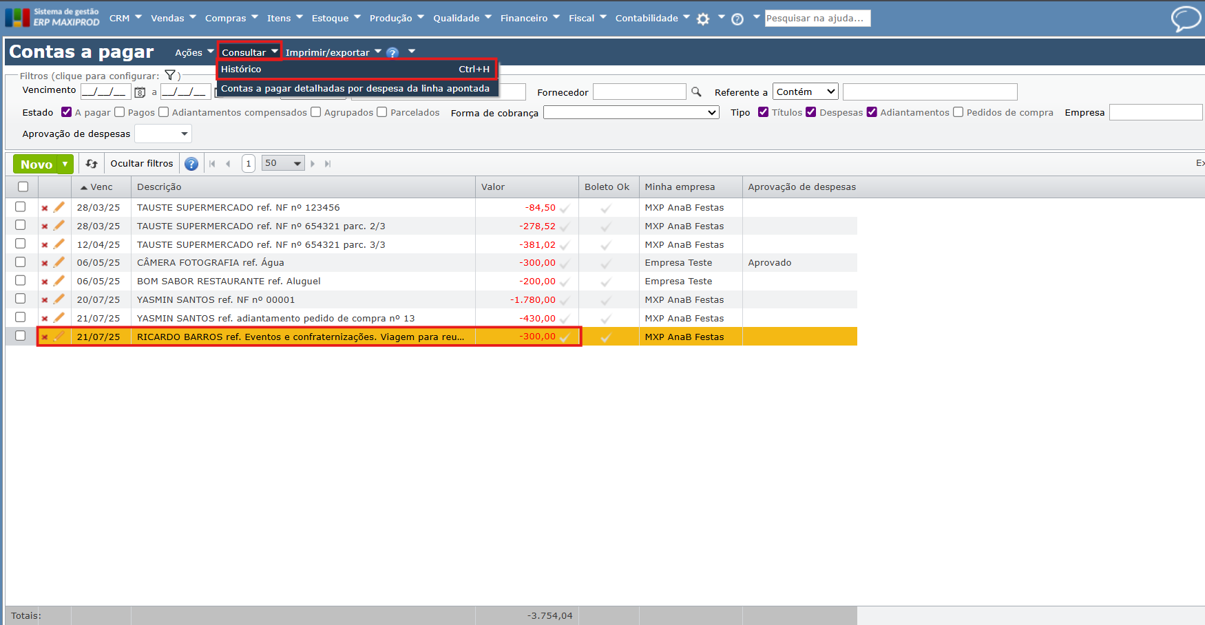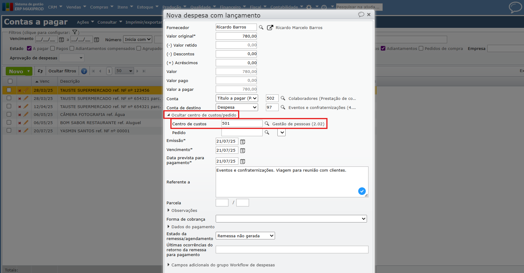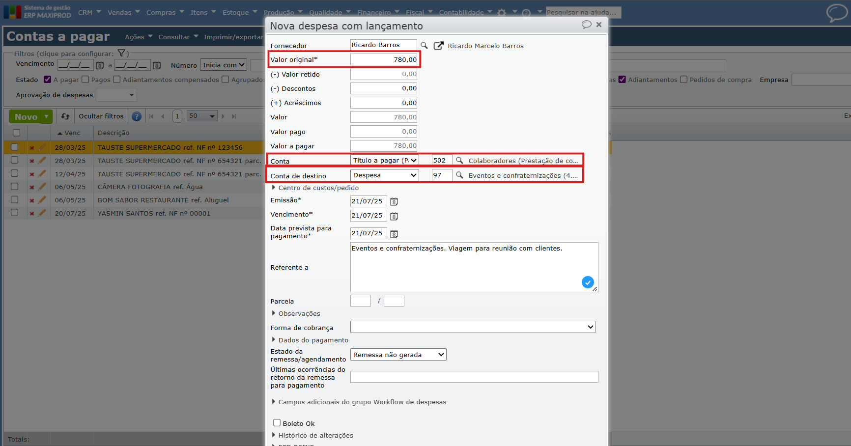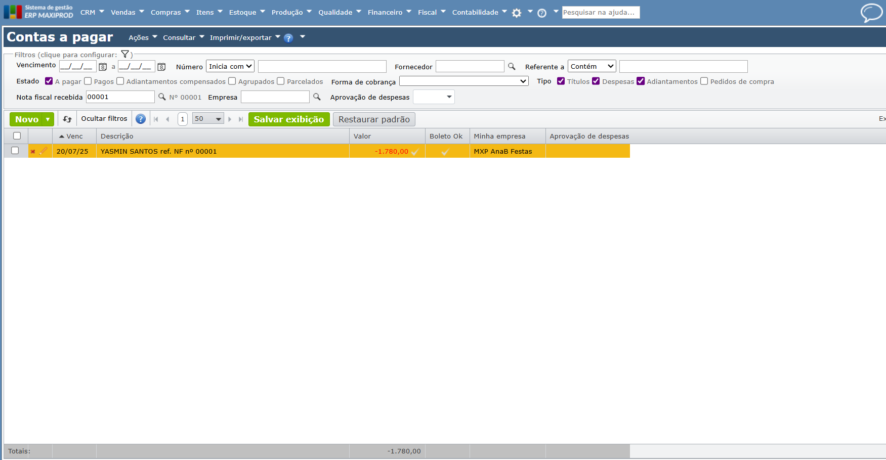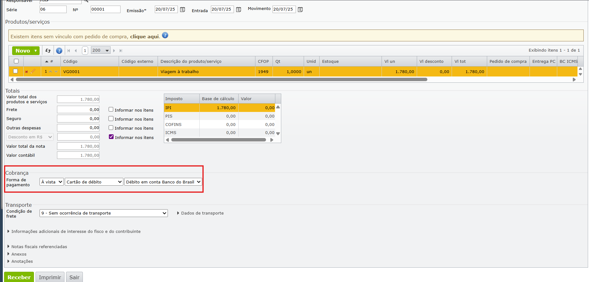 i) Ao receber a nota fiscal, são geradas as contas a pagar, conforme as definições preenchidas anteriormente na seção “Cobrança” da nota fiscal simbólica.