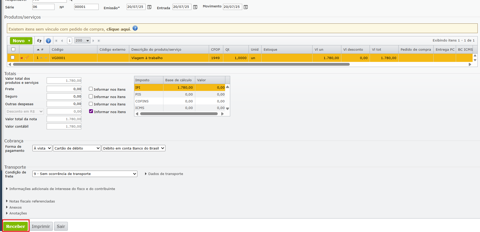h) No rodapé da tela de edição da nota fiscal, clique no botão verde “Receber” para efetivar a entrada da nota fiscal.