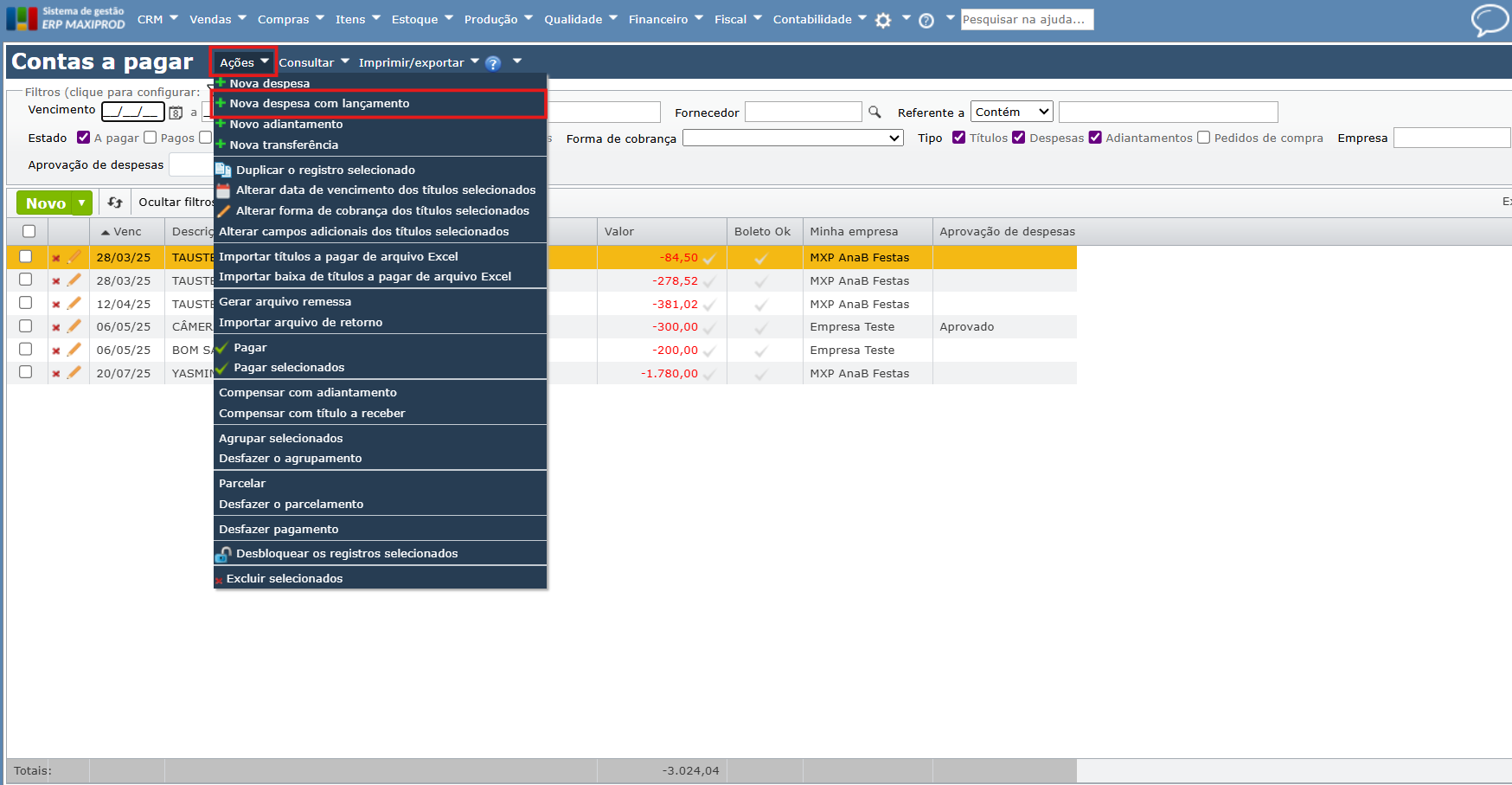 a) Na tela de “Contas a pagar”, vá ao menu “Ações > Nova despesa com lançamento”. Para saber qual é a diferença entre nova despesa e nova despesa com lançamento, clique aqui.