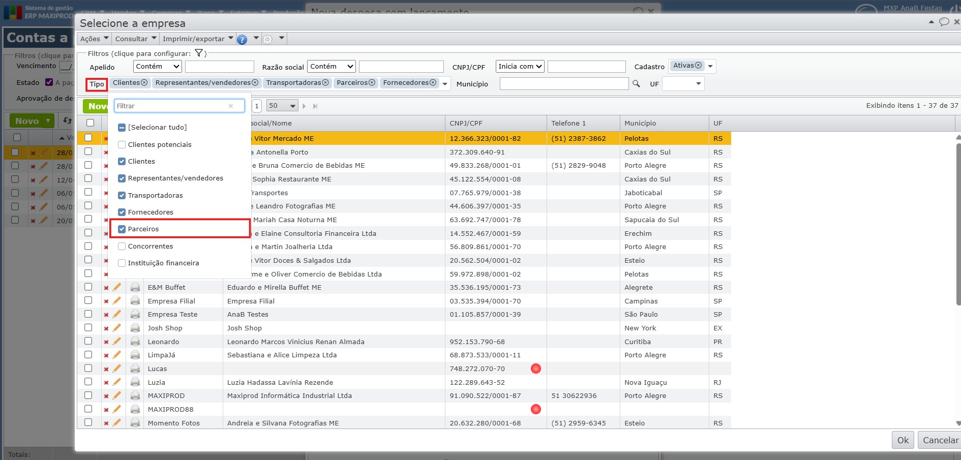 b) Preencha o campo “Fornecedor” com o cadastro do colaborador. Para isso, clique no ícone da lupa para abrir a tela de seleção de empresas, marque a opção “Parceiros” no filtro “Tipo”, atualize a grade e selecione o colaborador.