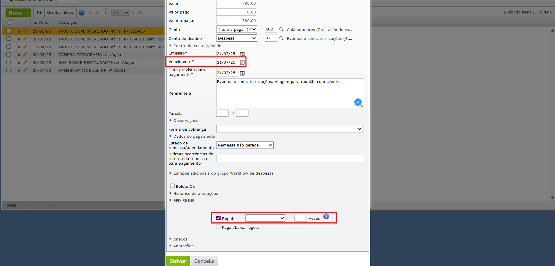 e) Informe a data de vencimento da despesa. Caso seja uma despesa fixa, utilize a opção “Repetir”, informe a periodicidade do lançamento e o número de repetições.