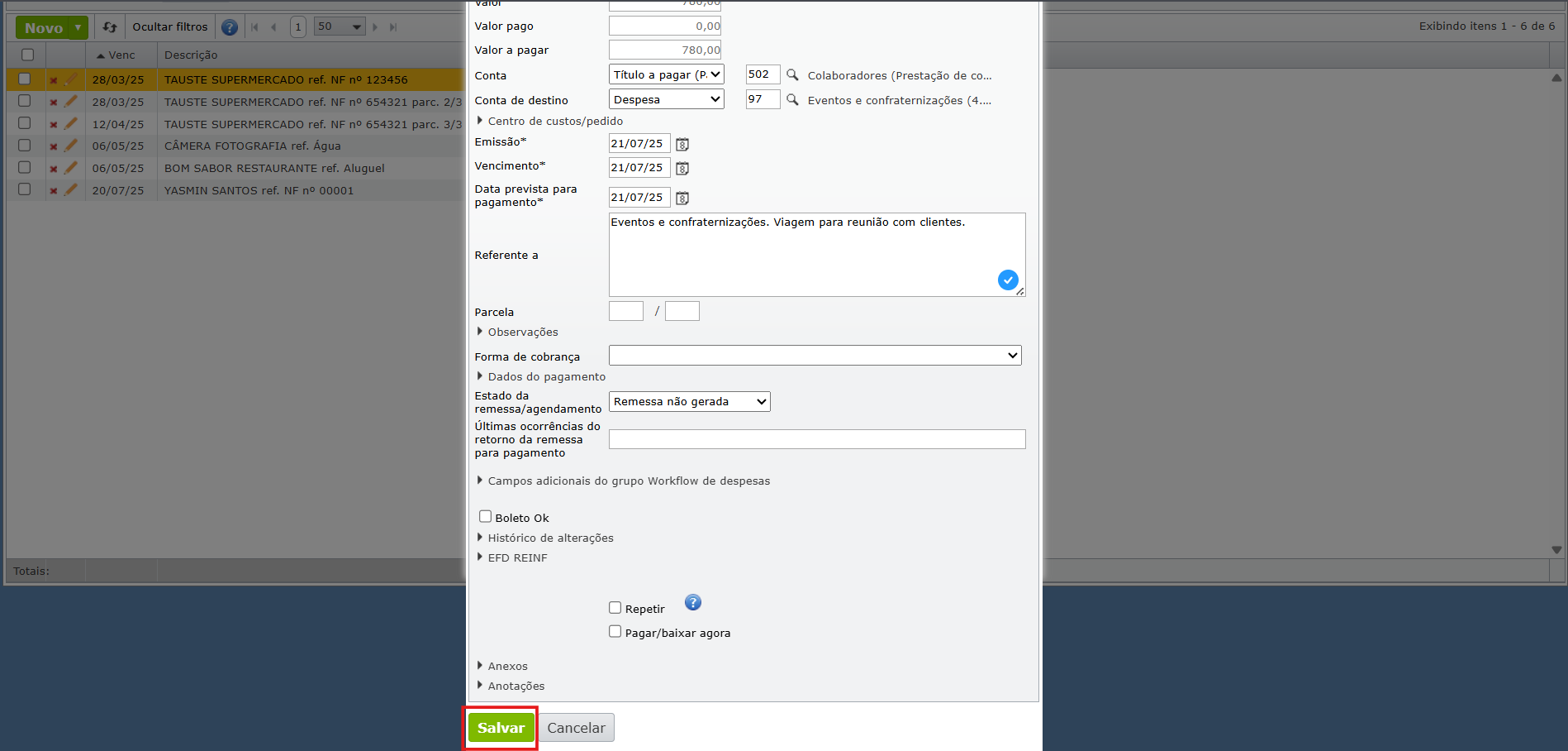 g) Preencha os demais campos necessários e clique no botão verde “Salvar” para efetivar a criação das novas despesas. Para saber mais sobre contas a pagar, clique aqui.