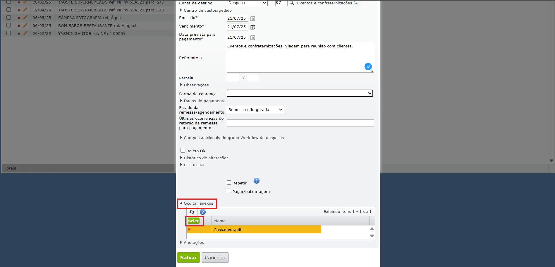 f) Se for o caso, anexe os comprovantes de despesas do colaborador. Inclua todos os documentos que justificam os gastos realizados, no campo “Anexos”. Clique no botão verde “Selecionar” para escolher os arquivos em sua máquina.