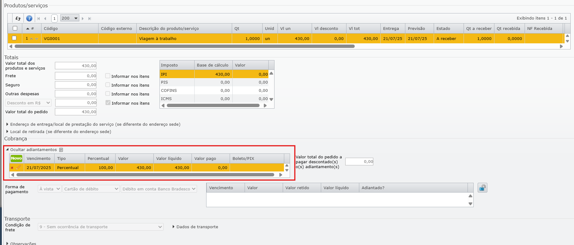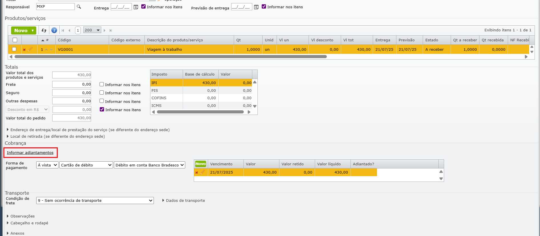 Obs.: se o pedido estiver em moeda estrangeira, os adiantamentos criados a partir dele virão automaticamente na moeda estrangeira. Para saber mais, clique aqui.