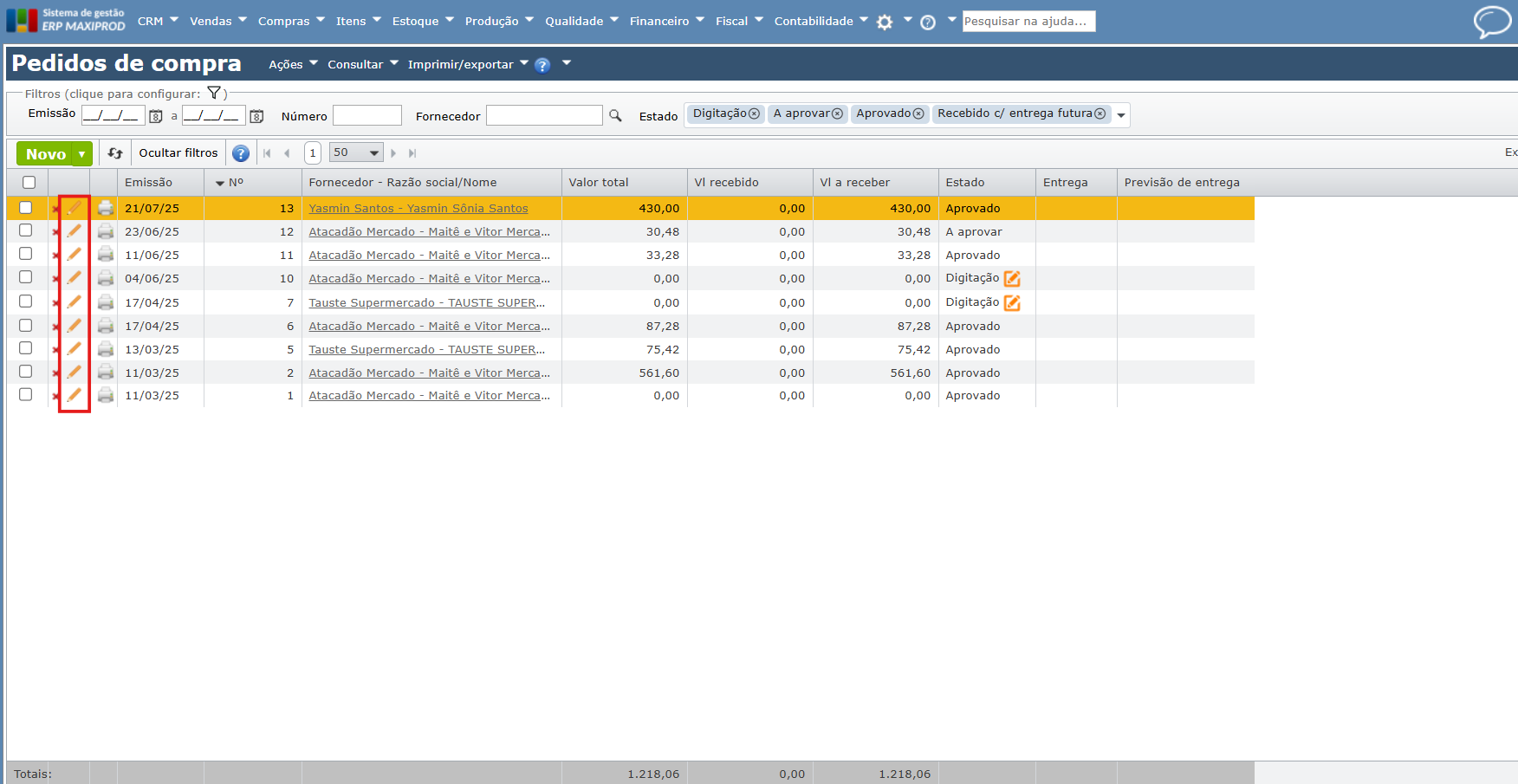 1) Acesse a tela de edição do pedido de compra, através do menu “Vendas > Pedidos de compra” e abra a tela de edição do pedido, através do lápis de edição ou duplo-clique no registro desejado.