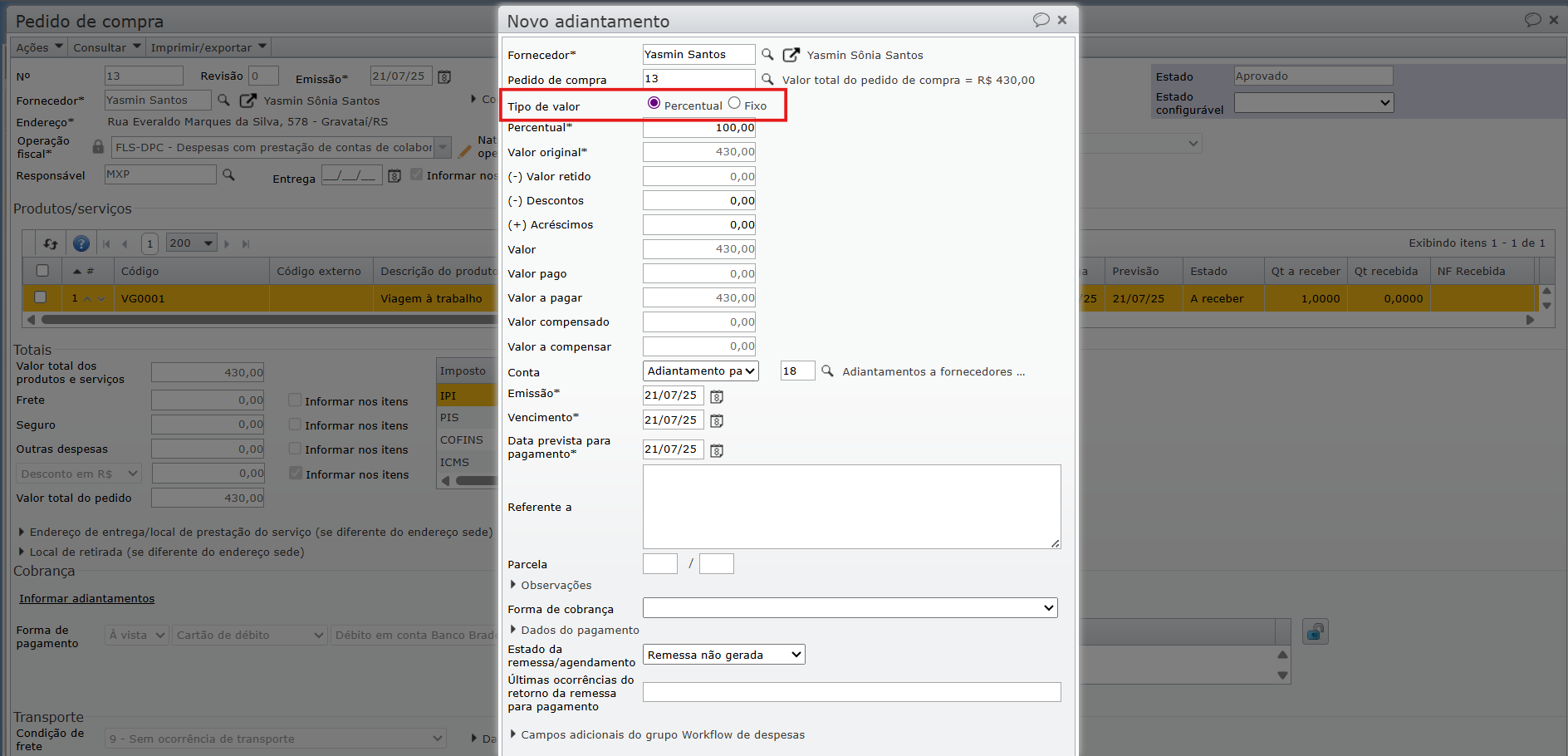 3) Selecione o “Tipo de valor” que pode ser “Percentual” ou “Fixo”, ou indique o valor do adiantamento em “Valor original”.