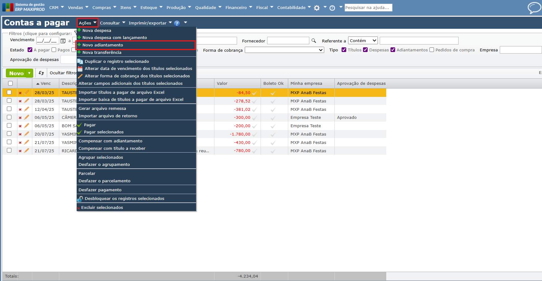 1) Na tela de “Contas a pagar” (acessada pelo menu “Financeiro > Contas a pagar”), acesse o menu “Ações > Novo Adiantamento”.