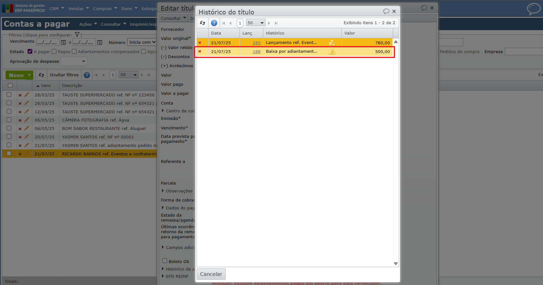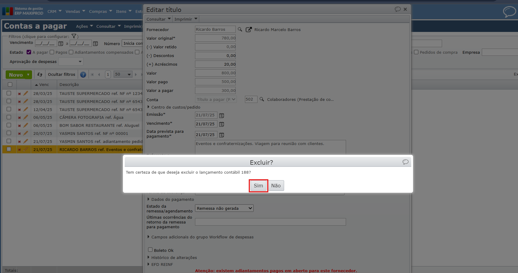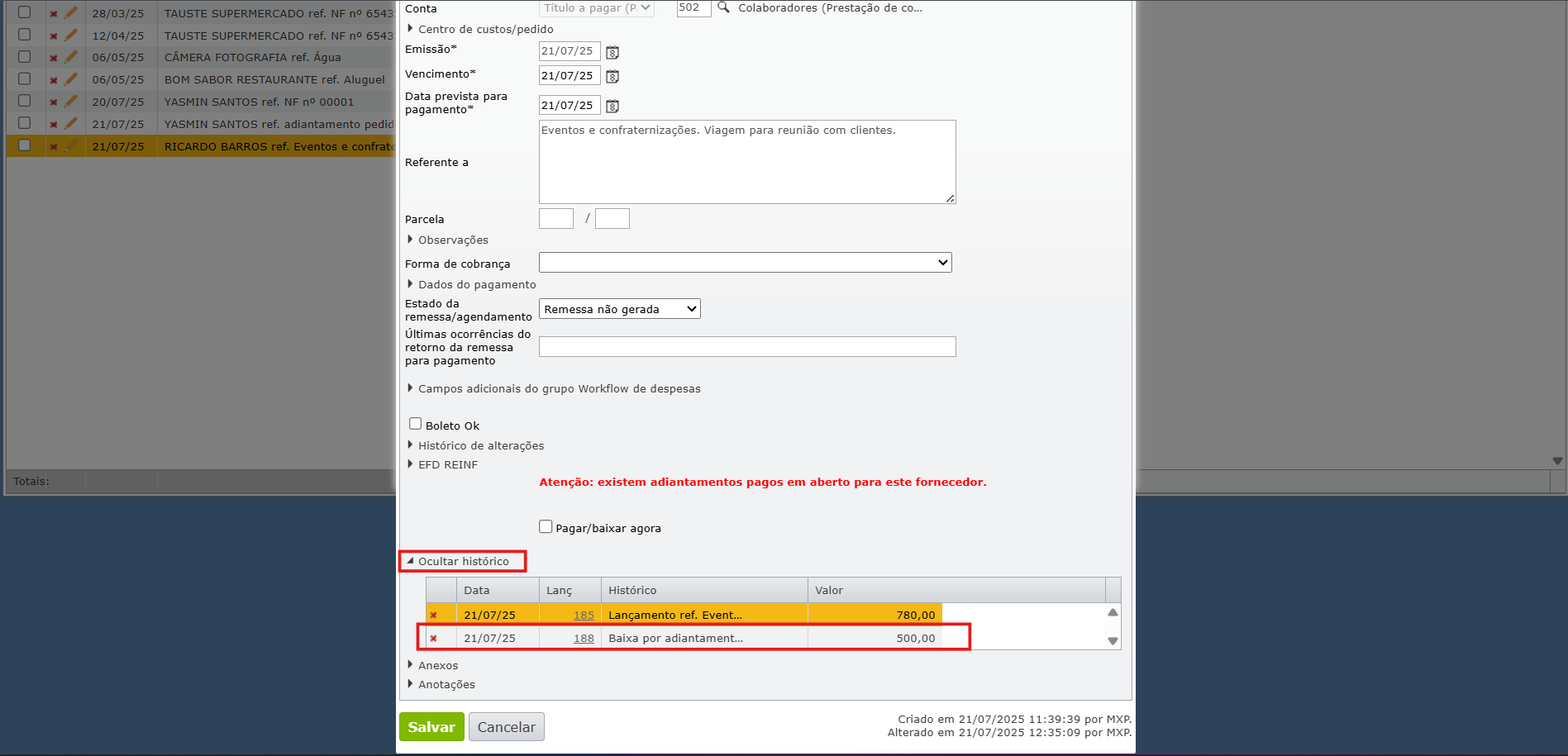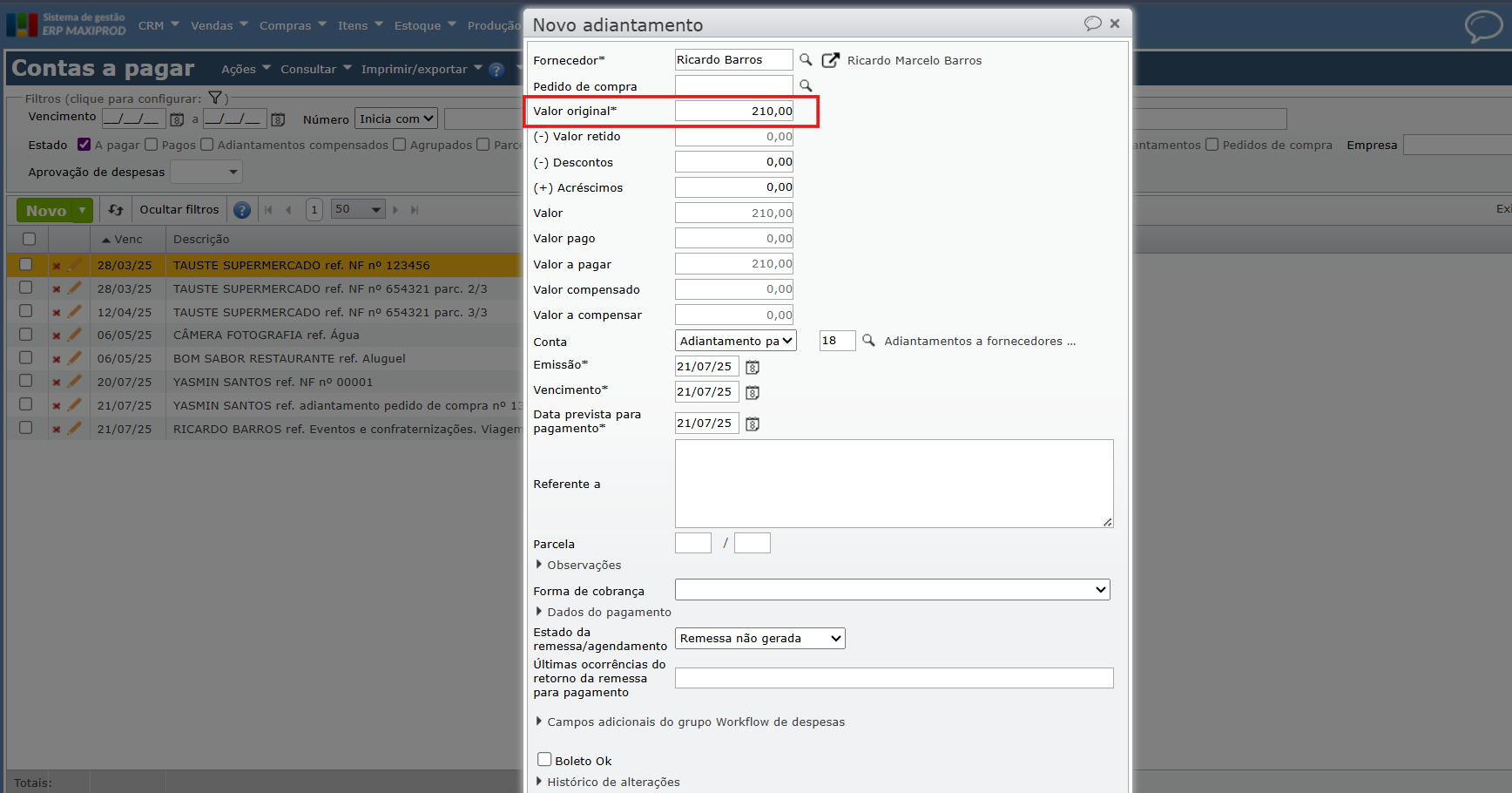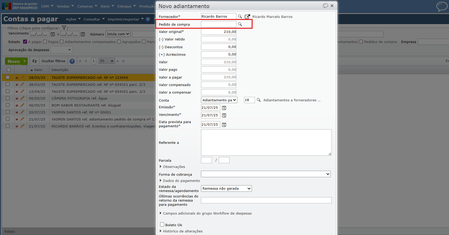 4) Será gerado automaticamente o adiantamento nas contas a pagar, já vinculado a esse pedido.