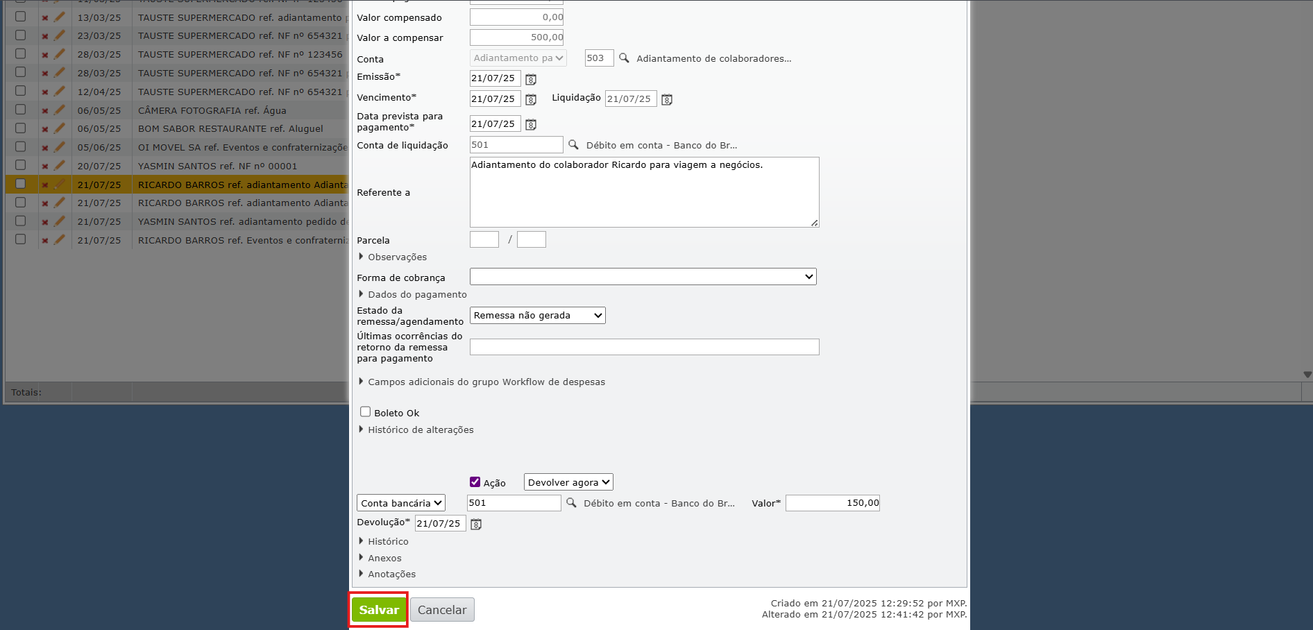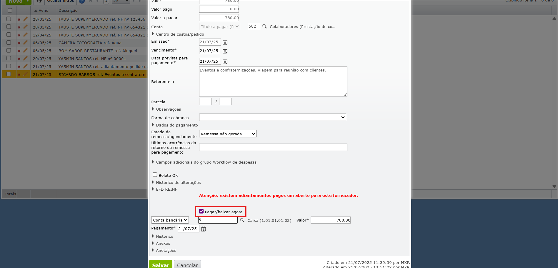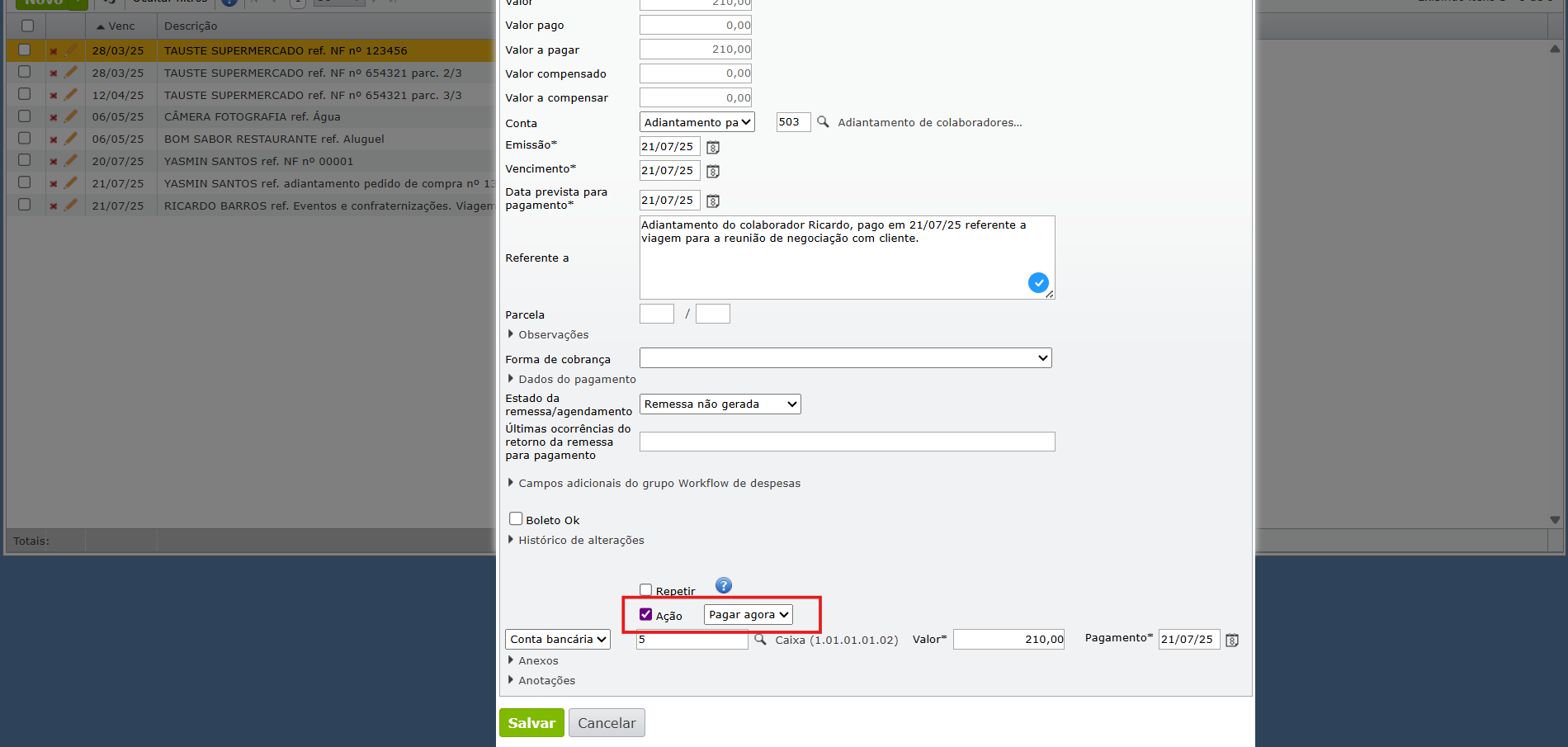4) Preencha os dados necessários e clique em “Salvar”. Para efetivar o adiantamento, marque a caixa de seleção “Ação”, deixe a opção “Pagar agora” selecionada, preencha os dados do pagamento e clique em “Salvar”. No entanto, o adiantamento pode ser efetivado depois.