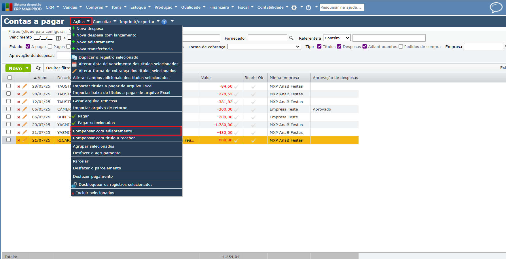 1) Para compensar o adiantamento, selecione o título a pagar e acesse o menu “Ações > Compensar com adiantamento”.