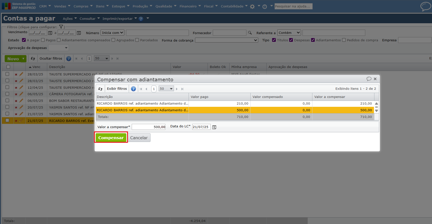 2) A nova janela exibe os adiantamentos pagos ao colaborador. Selecione o adiantamento referente a essa compra e clique no botão verde “Compensar”.