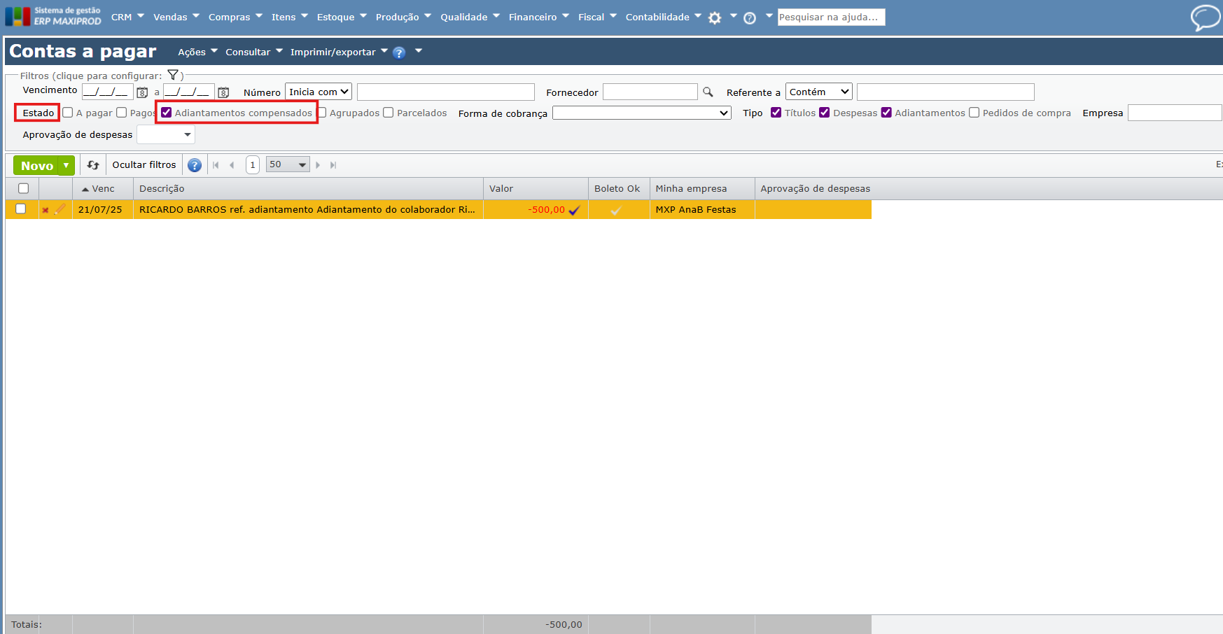 Atenção: para localizar mais facilmente os títulos, o usuário pode usar a opção “Adiantamentos compensados” no filtro “Estado” da grade de contas a pagar.