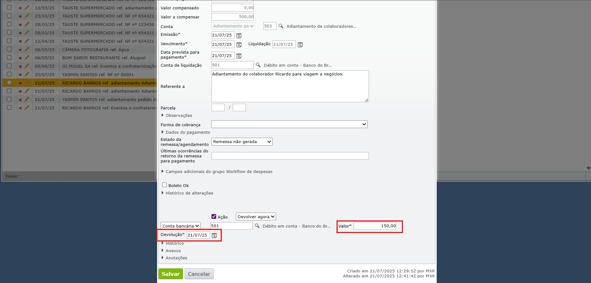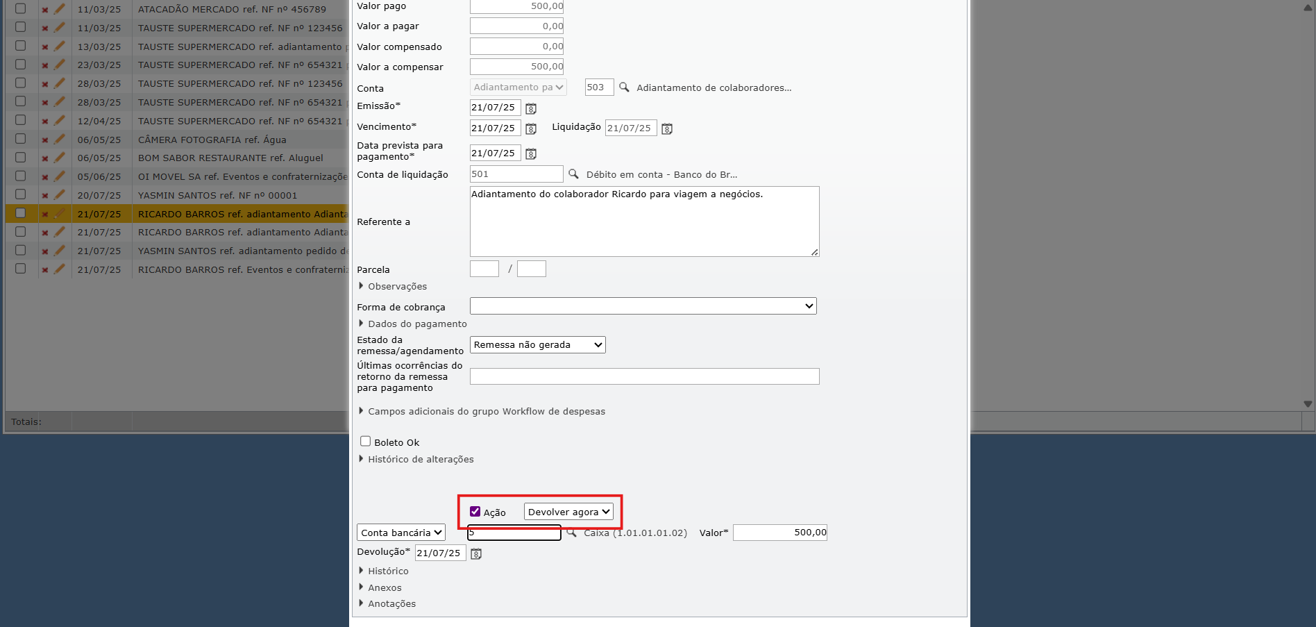 1) Quando o adiantamento foi  pago, e há uma devolução do seu valor total ou parcial, o usuário deve editar o adiantamento pago, marcar a caixa de seleção “Ação” e alterar a opção ao lado de “Receber agora” para “Devolver agora”.