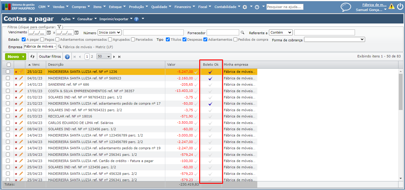 O ERP MAXIPROD gera automaticamente as contas a pagar, à medida que as notas de entrada são emitidas ou recebidas. Ao programar os pagamentos, o setor de contas a pagar costuma organizar e conferir os boletos, deixando tudo pronto para o pagamento. O campo “Boleto Ok”, na janela de edição do título, permite indicar que o boleto do título a pagar chegou e está correto.