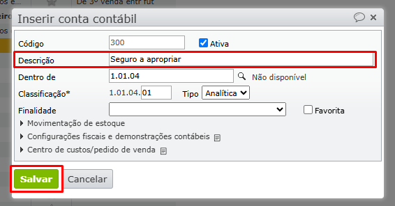a) A primeira conta é a de “Seguro a apropriar” e deve ser colocada no “ativo”, representando seu benefício. Após configurar, clique em “Salvar”.
