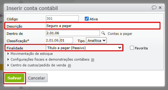 b. A segunda conta se trata de “Seguro a pagar” com finalidade de “Título a pagar(Passivo)” e deve ser colocada no “passivo”, representando sua obrigação a pagar. Após configurar, clique em “Salvar”.