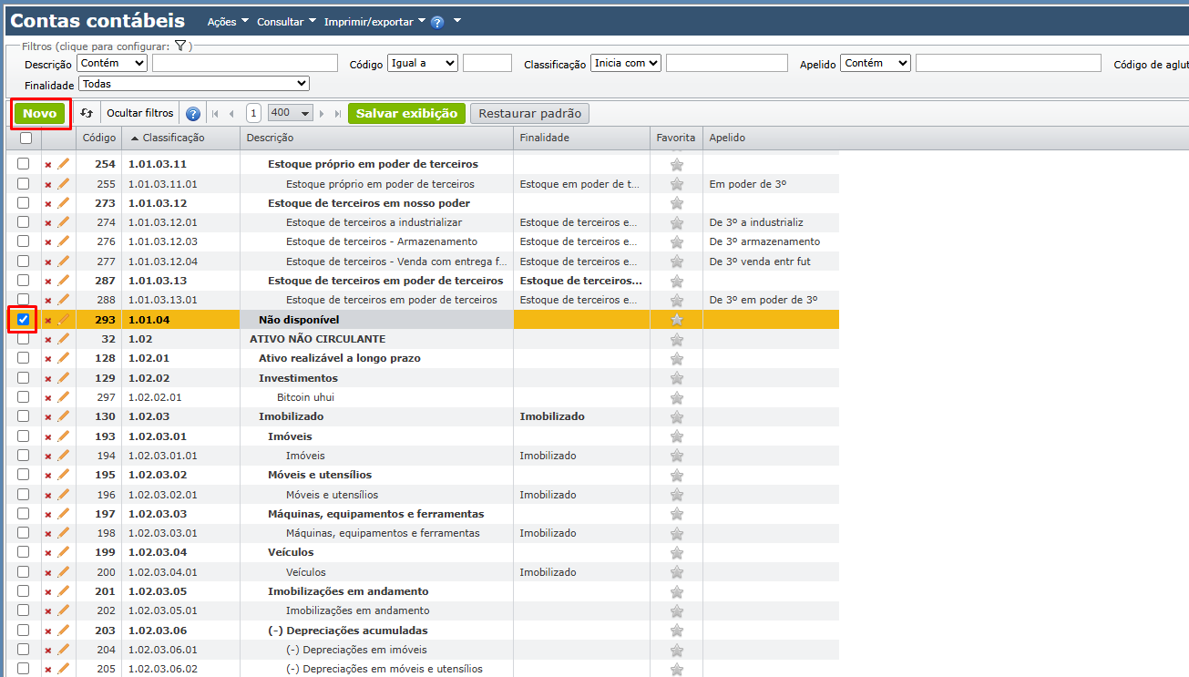 2) Na tela de contas contábeis, procure uma conta contábil semelhante à que deseja criar. Selecione a conta, deixando sua linha amarelada, e clique no botão verde “Novo”. Deverão ser criadas duas contas.