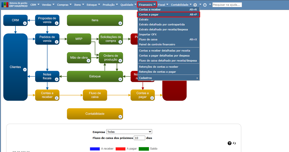 1) Para indicar o pagamento da parcela, devemos ir até o título criado no tópico acima, acessando “Financeiro > Contas a pagar”.