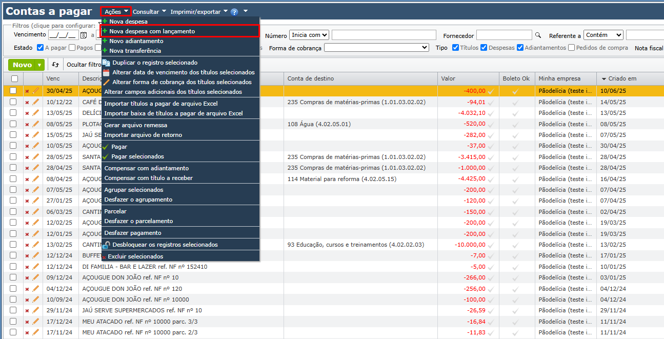 2) Na tela de contas a pagar, vá em “Ações > Nova despesa com lançamento”.