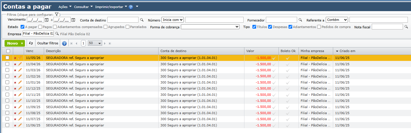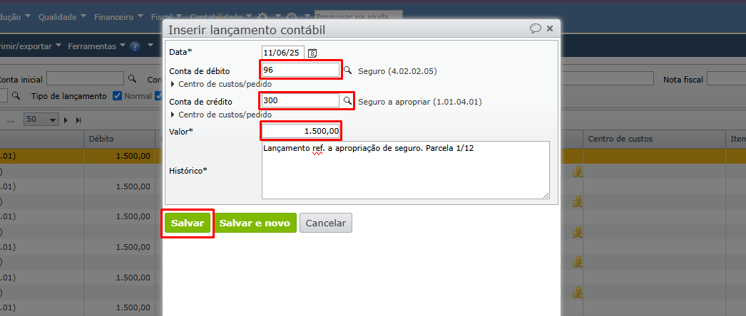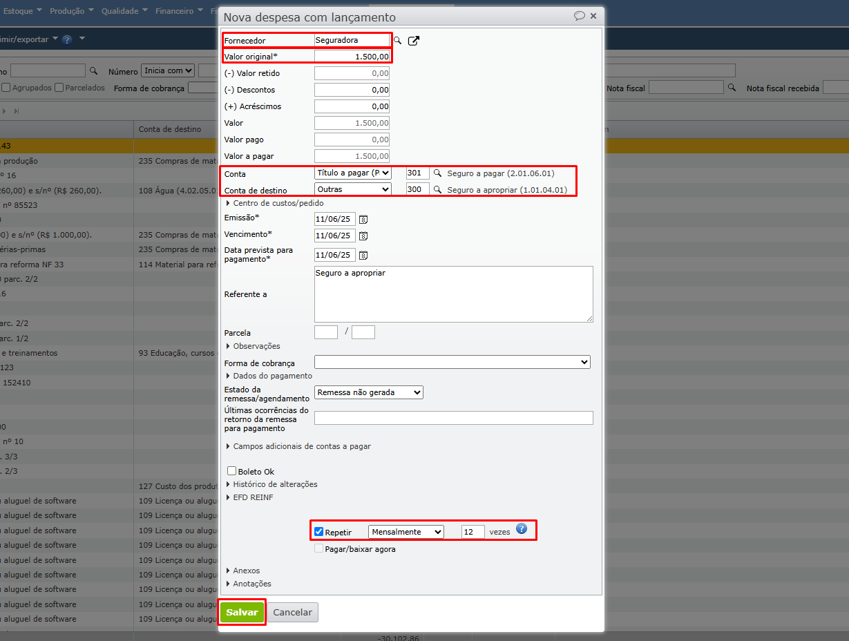 - Conta: informe a conta “Seguro a pagar” criada no tópico anterior.