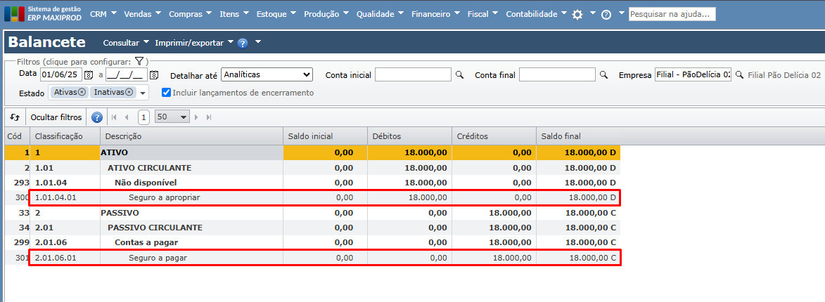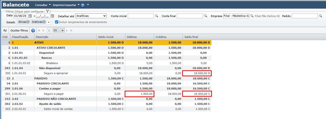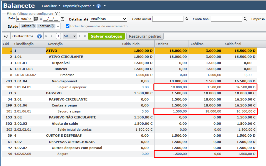 5) No balancete, é possível ver as contas, onde a conta contábil “Seguro a apropriar” representa o seu bem, e a conta contábil “Seguro a pagar” representa sua dívida.