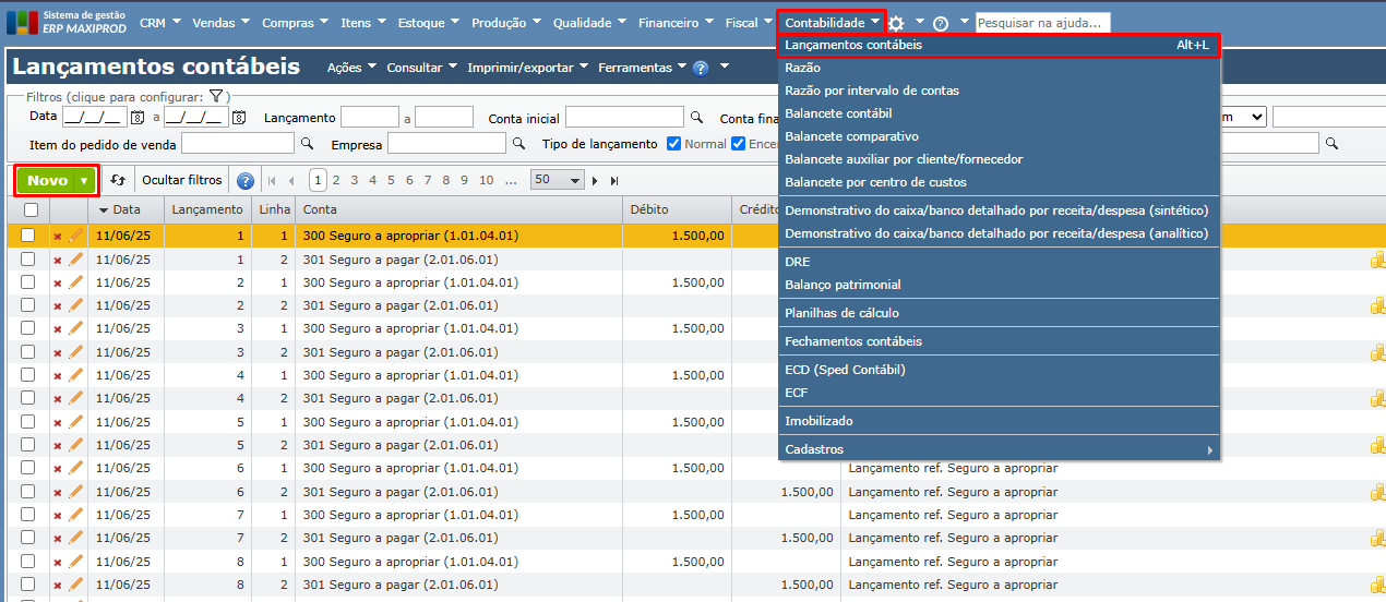 3) Acesse “Contabilidade > Lançamentos contábeis” e clique no botão verde “Novo”.