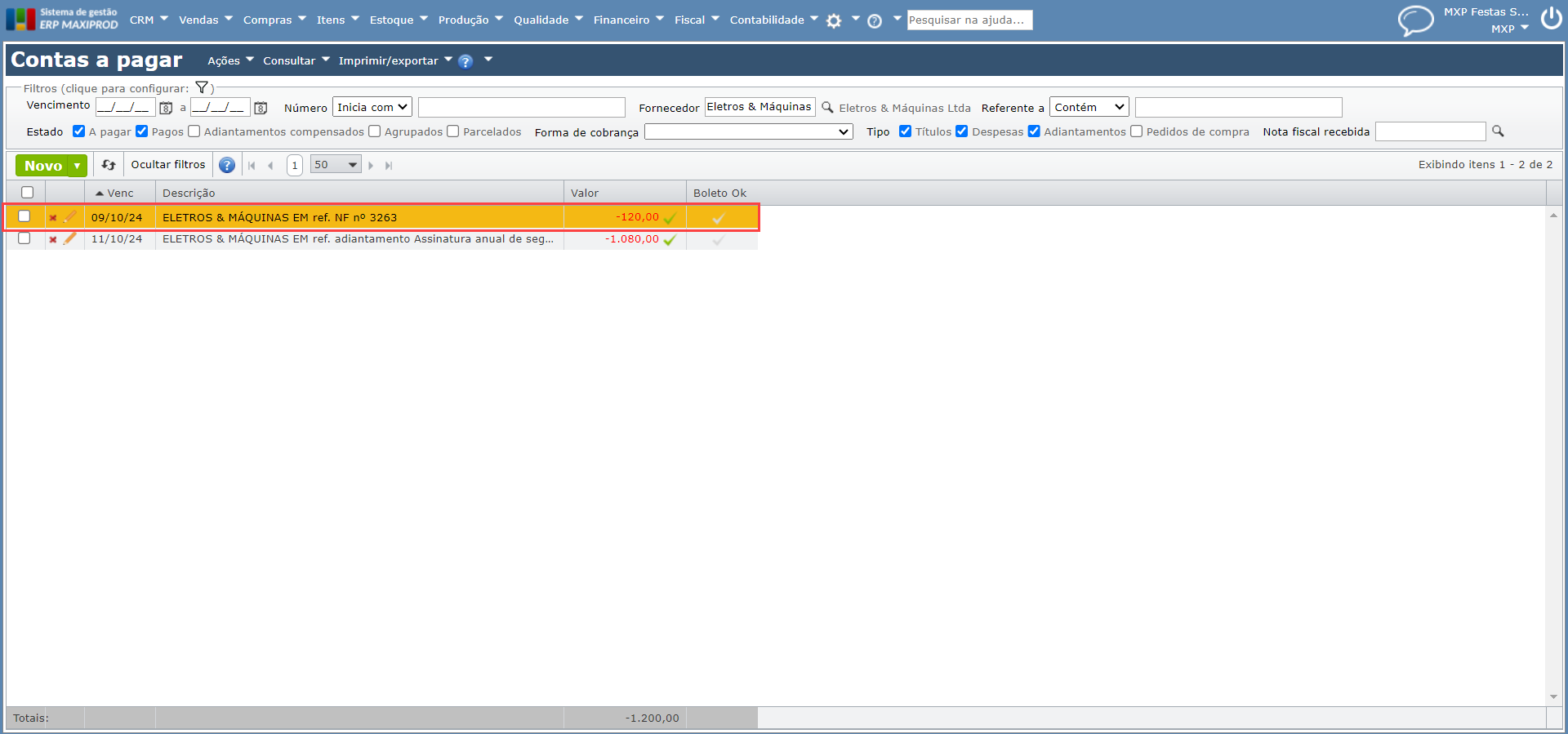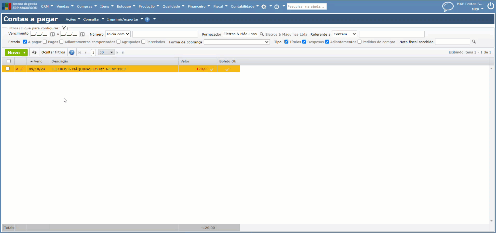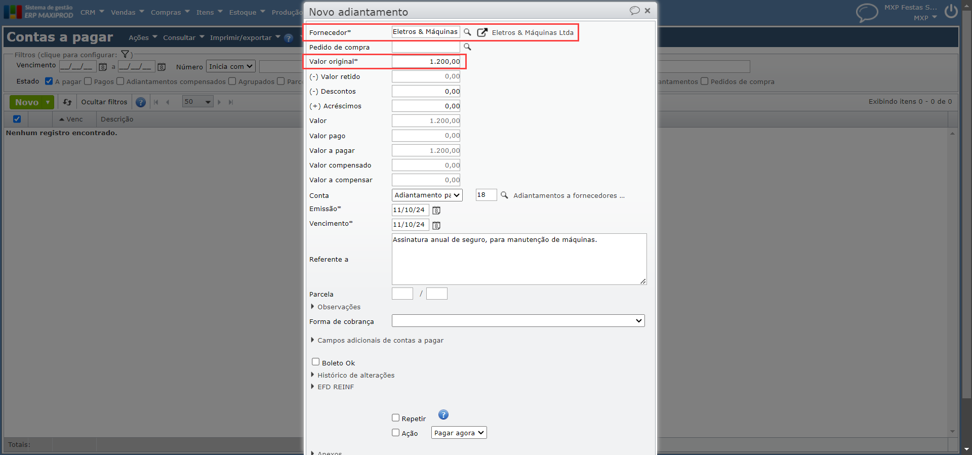 Para traduzir esta informação para o ERP MAXIPROD, é possível utilizar adiantamentos.