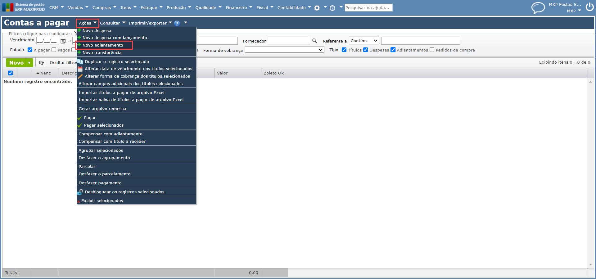 2) Utilize o menu “Ações > Novo adiantamento”.