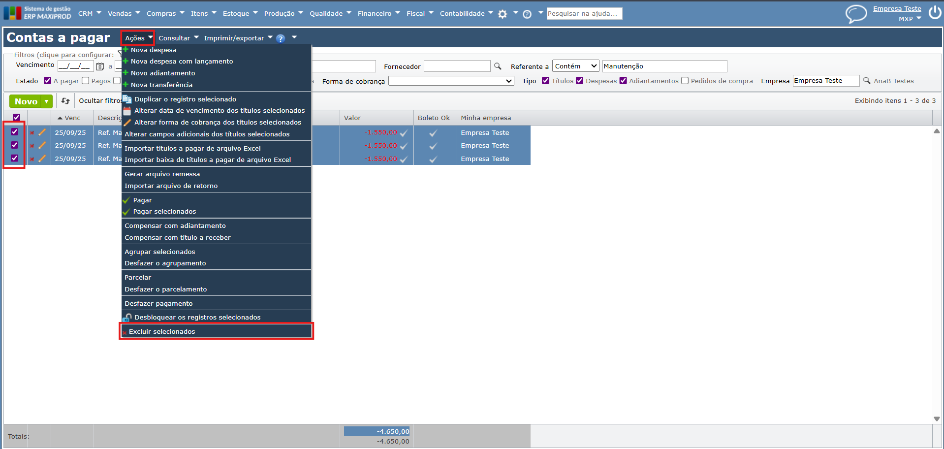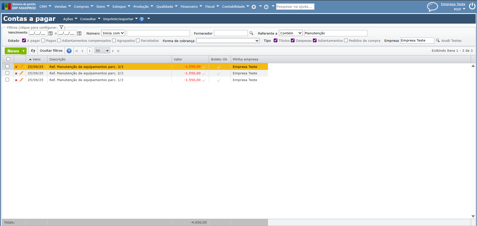 Seja um lançamento de Contas a pagar, em 3 parcelas, na Empresa Teste, referente a manutenção de equipamentos, que deveria ter sido lançado na Empresa Filial.