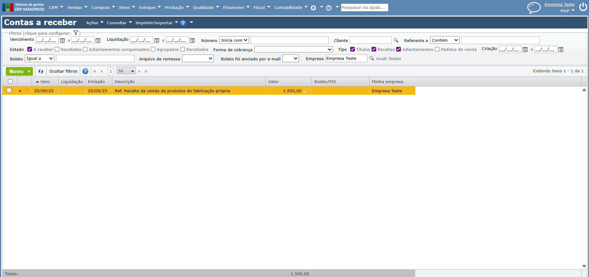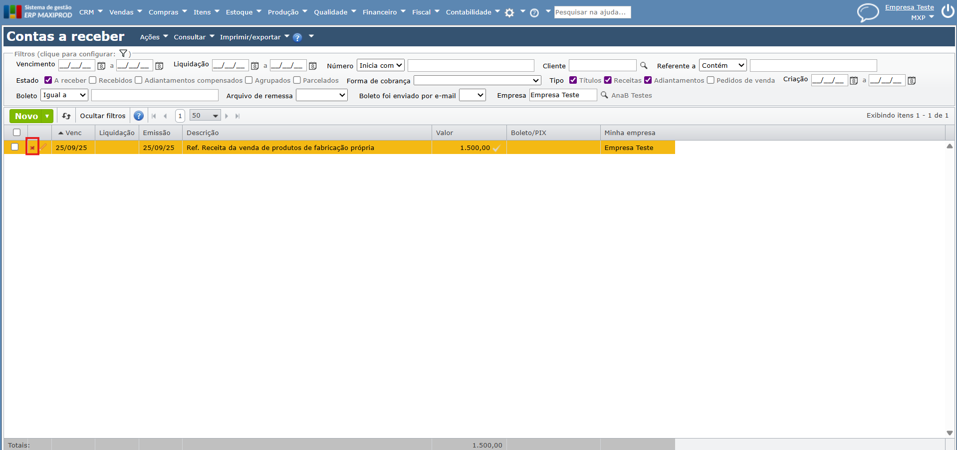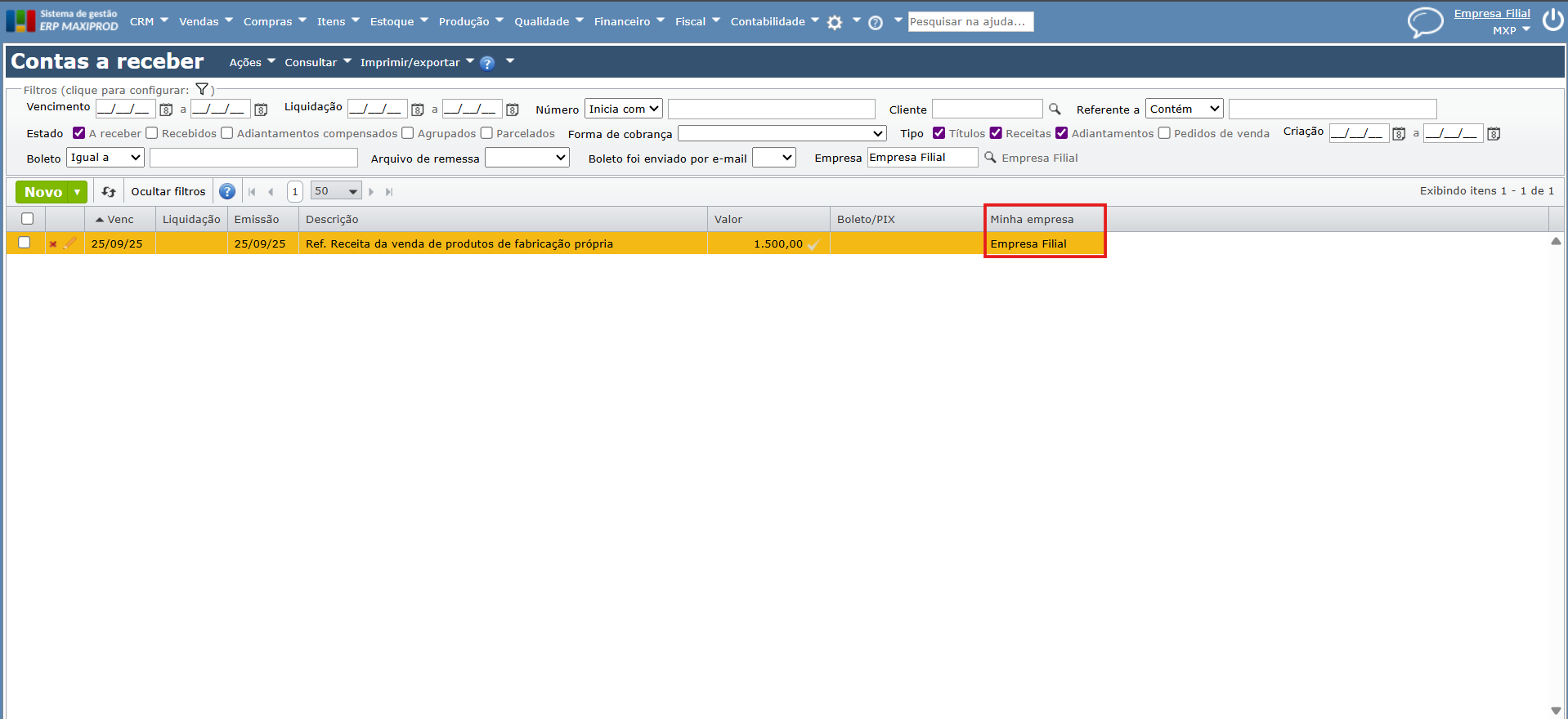 Seja um lançamento de Contas a receber, na Empresa Teste, referente a receita da venda de produtos de fabricação própria, que deveria ter sido lançado na Empresa Filial.
