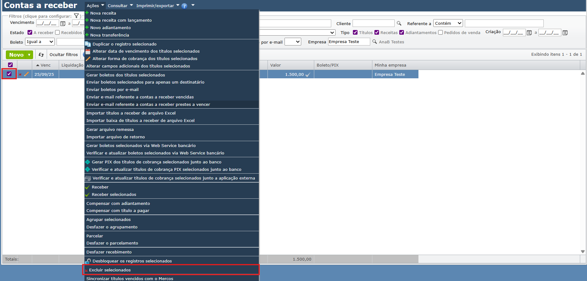 4) Altere a empresa e recadastre os títulos na empresa correta seguindo os procedimentos padrão de criação de contas a receber.