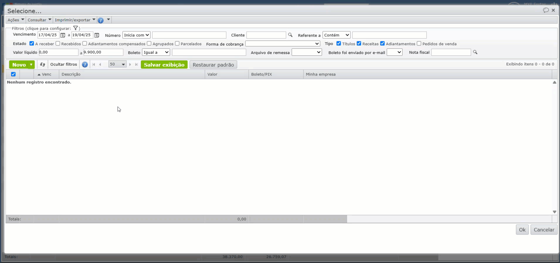 3) Clicando no ícone de “seta para baixo”, para fazer a conciliação por meio de contas a receber/a pagar, este título de R$ 9.900,00 não é localizado.