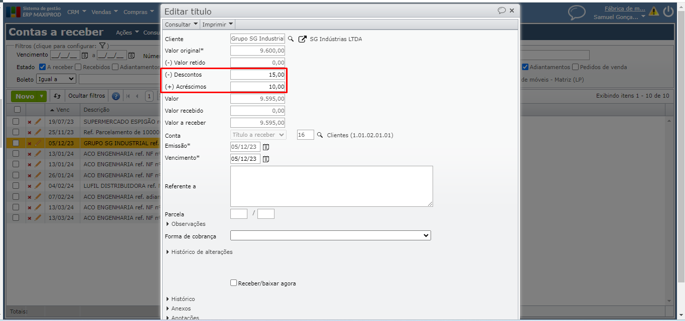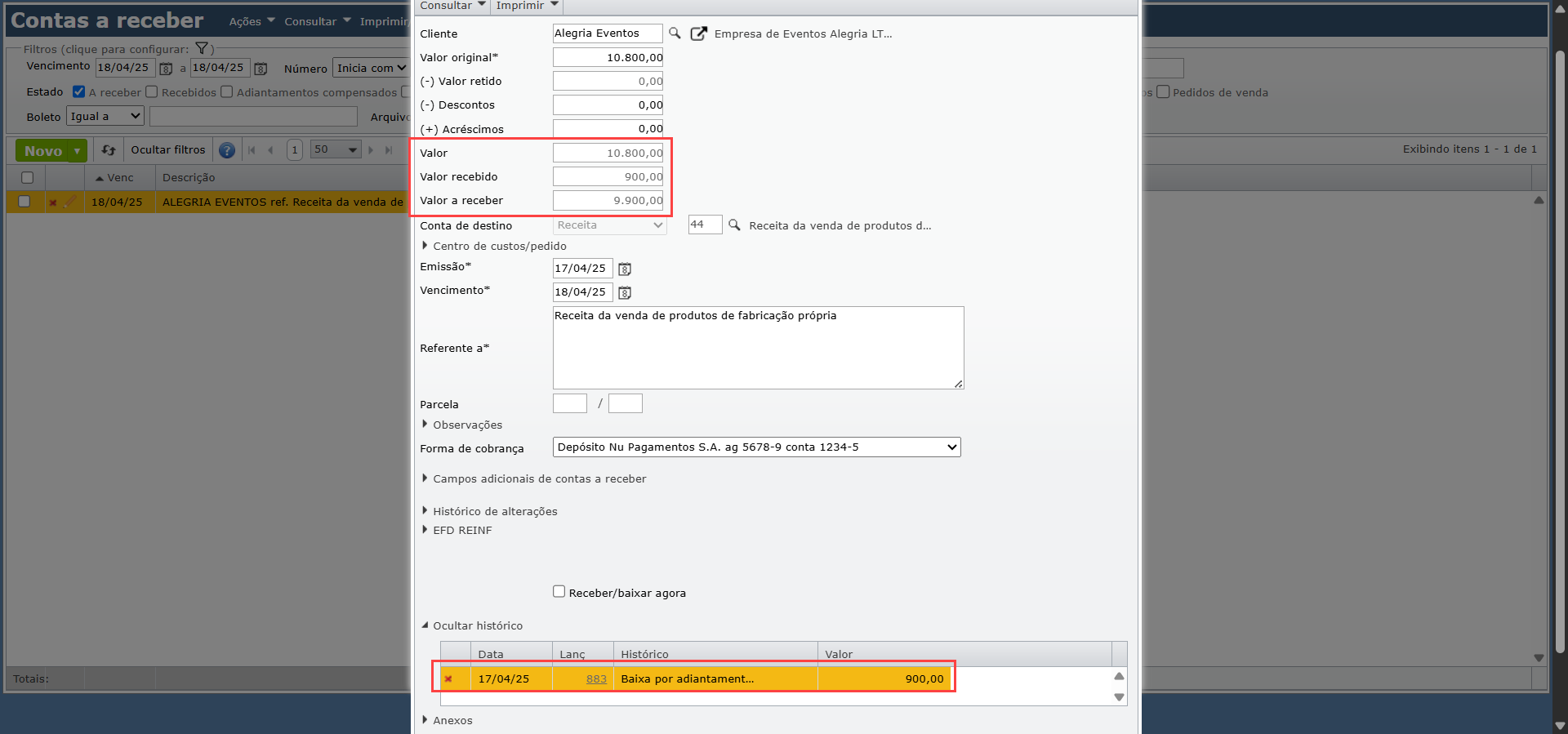 2) Na tela “Financeiro > Contas a receber”, foi criado um título a receber de R$ 10.800,00. Esse valor foi abatido com um adiantamento de R$ 900,00, sobrando R$ 9.900,00.