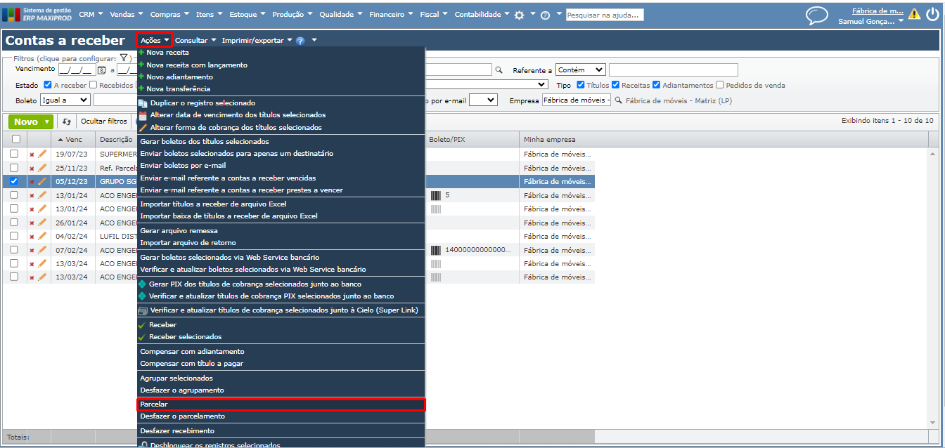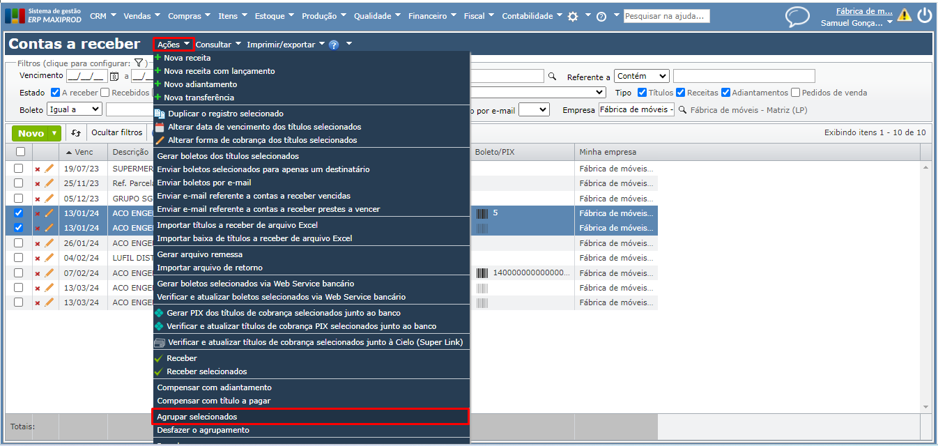 b) Quando um pagamento inicialmente parcelado for pago de uma única vez, é possível agrupar os títulos no sistema, convertendo-os em um único título. Para isso, o usuário deve selecionar os títulos na grade de “Contas a receber” ou “Contas a pagar” e utilizar o submenu “Ações > Agrupar selecionados”.