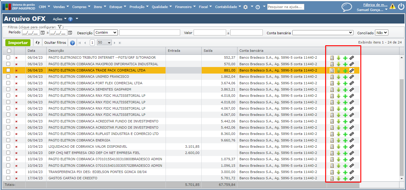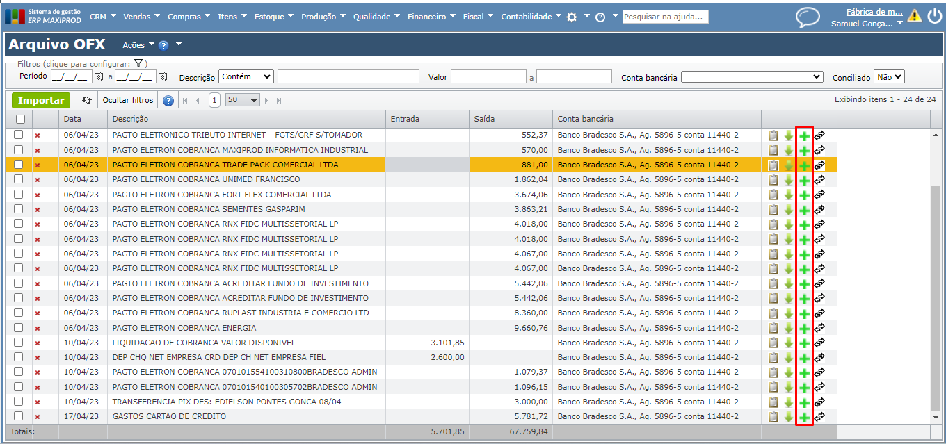 1) Na grade do “Arquivo OFX” (“Financeiro > Importar OFX”), verifique a data e o valor do registro não conciliado.